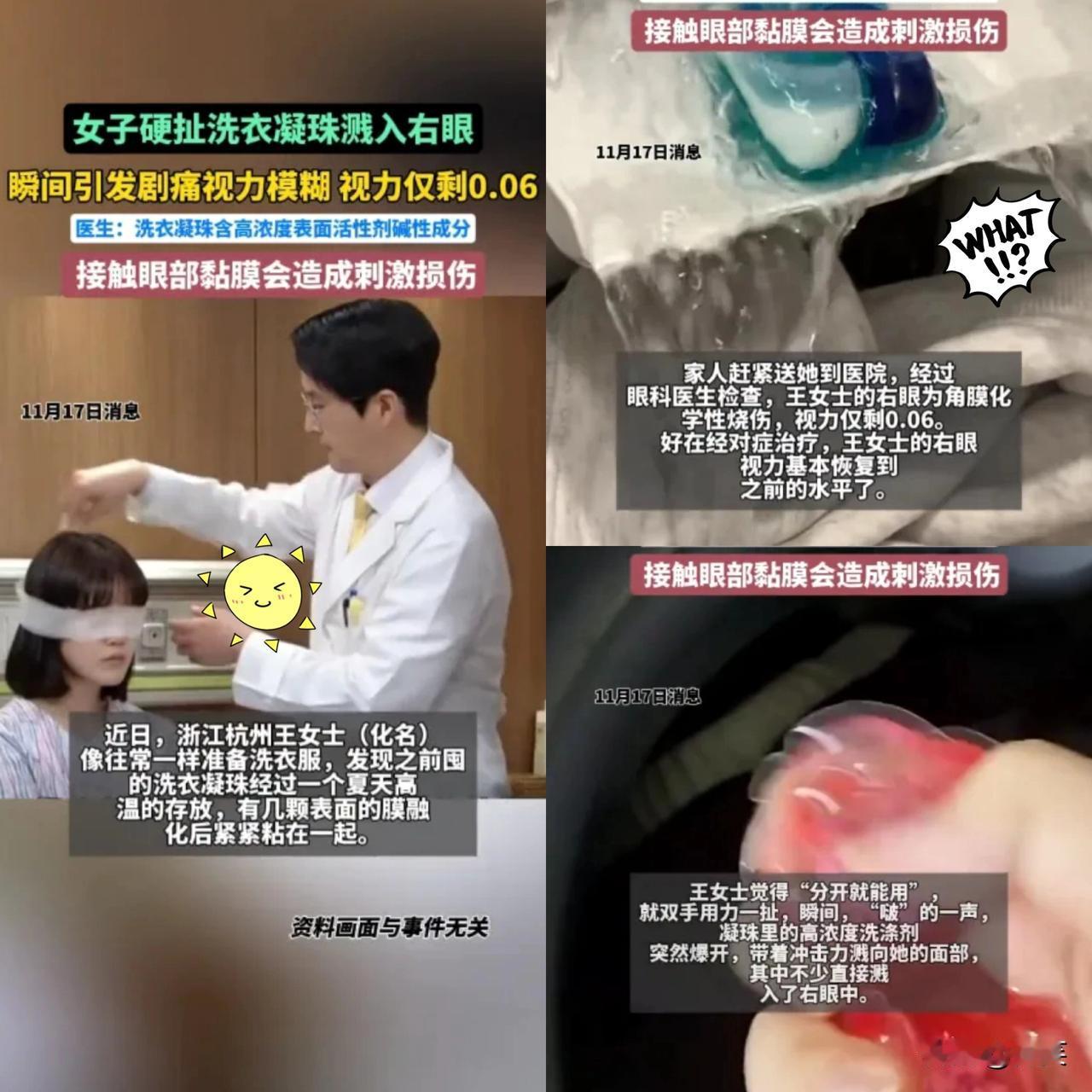 “悲剧还是发生了!”近日,浙江杭州,一女子洗衣服时,发现洗衣凝珠黏在了一起,她用力撕扯时,凝珠发生了爆炸,大量洗涤剂溅入眼睛!女子瞬间看不清东西,而且眼睛传来剧烈的疼痛,送往医院检查,发现视力仅剩0.06。网友:还是洗衣粉安全! 很多人觉得凝珠方便就随便囤、随便放,阳台高温处、卫生间潮湿角都敢塞,黏连了就硬扯,根本没意识到它多“娇气”。这哪是普通洗涤剂啊,高浓缩成分刺激性超强,外层水溶膜又怕热怕潮,稍微不当心就成了“隐形凶器”。 更关键的是,商家总盯着“方便”吆喝,安全提示藏在角落看不清,相关科普也跟不上。其实不是凝珠不能用,而是咱们得改改使用习惯:阴凉干燥处存放,别囤太久,黏连了用干毛巾擦开别硬扯。 日用品的安全,从来都藏在细节里。你家的洗衣凝珠是怎么存放的?有没有遇到过黏连的情况?