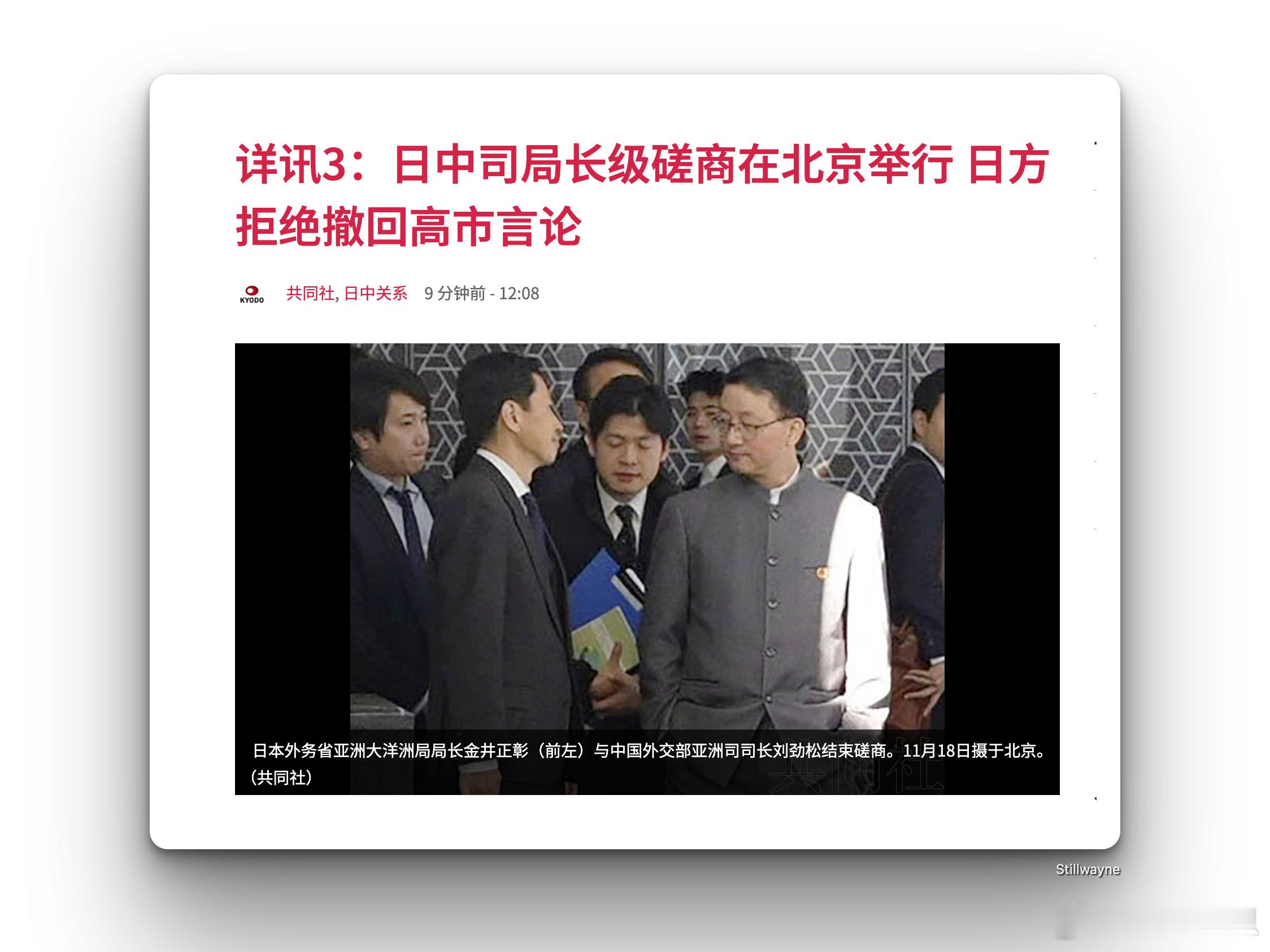 中日司局级会谈后,日方拒绝撤回高市言论中方指出,“高市的谬论从根本上损害中日关系政治基础,性质和影响极其恶劣,激起中国人民的公愤”。对此,中方要求撤回言论。日本外务省亚洲大洋洲局局长金井正明表示拒绝。针对以日本治安问题为由提醒中国公民避免前往日本一事,金井正明称“日本的治安绝对没有恶化”。