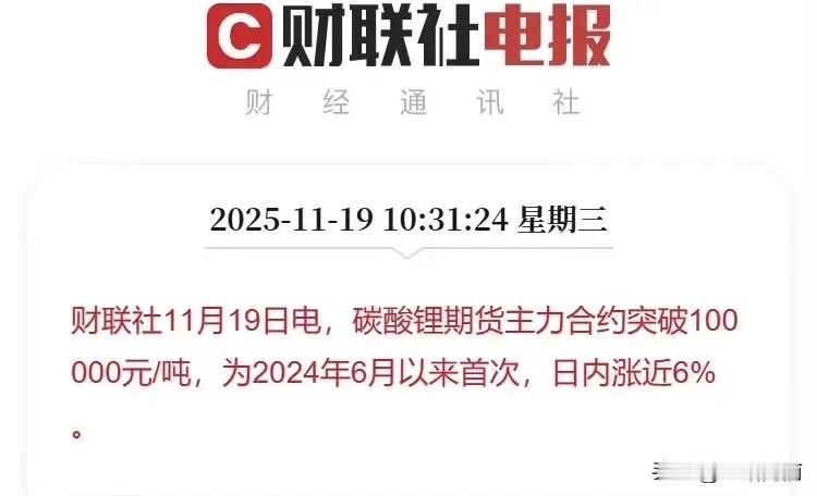 碳酸锂重回10万/吨大关了。 是2024年6月以来的首次,一年多的高位,这样的话,动力电池成本也要看涨的。 说白了,碳酸锂它就是动力电池的“核心原料”,占电池成本的30%以上,堪称“白色石油”。现在从6月的5.99万/吨涨到10万,5个月暴涨40%多,动力电池成本必然跟着涨,最后大概率要传导到车价上! 更关键的是供需彻底失衡了:供应端江西锂矿复产延迟,冬季盐湖还得减产,库存已经连续13周下降,只剩12万多吨,够行业用20多天的,快触到安全线了;需求端却疯涨,新能源汽车旺季抢装+储能需求暴增,明年储能装机增速预计超40%,光这俩就把原料抢疯了。有行业大佬预测,要是需求再超预期,价格可能冲15万甚至20万/吨! 这还不算完,明年新能源汽车购置税要减半,之前靠补贴和低价抢市场的新势力,现在腹背受敌:原料涨价压利润,政策退坡少优势,最近股价和销量走势疲软也就不奇怪了。毕竟连六氟磷酸锂这类配套材料都一个月涨90%,车企想不亏都难!