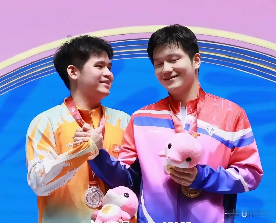 到底是谁拍的这张照片,必须要给摄像师加鸡腿! 这张照片里林诗栋终于和自己的偶像站到了同一领奖台上,获得金牌的东东大王在和自己的小迷弟小石头握手! 小石头一脸崇拜的看着大哥,有许多话想说但又不知道从何说起,眼神都要拉丝了,把东东大王看的都害羞了,低着头害羞得笑着! 樊振东和林诗栋的相貌、高度、体形、气质都很相似,都是南方人的特征,好似亲兄弟。 抓拍的照片更易引发大众共鸣,传播体育精神。东哥蝉联冠军是乒乓人的骄傲,更是对自己拼搏奋斗的认可!林诗栋的银牌意义非凡,未来可期!两个人发自内心的笑容,温暖了所有观众的心!祝福他们! 祝愿林诗栋跟着樊振东的步伐一步一个脚印努力 坚强 坚韧奋进,达到巅峰,为国争荣耀!