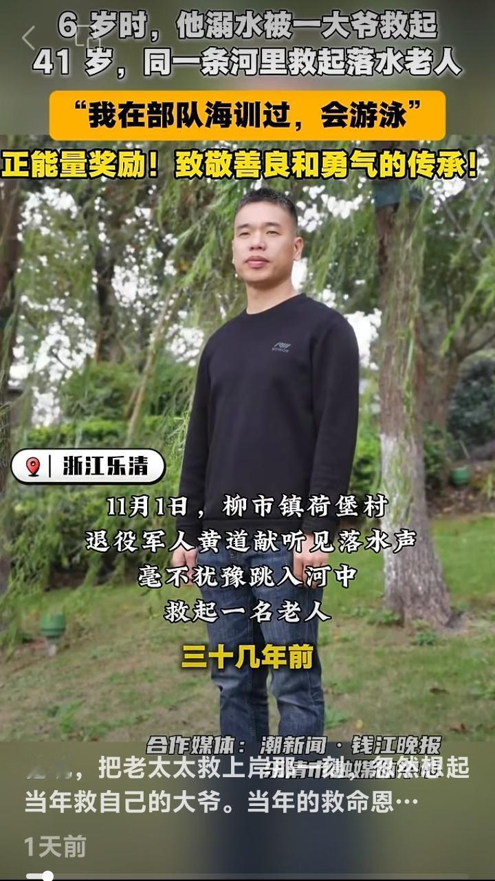 三十五年后他纵身跃入同一条河流!乐清退役军人黄道献冰河救老人 童年被救记忆重启生命轮回 (來源:潮新聞客户端) 初冬的河水寒意刺骨,一条普通的乡村河流畔,41岁的黄道献扔下扫帚冲向河岸。水中一位老人正在挣扎,花白的头发在浑浊的河面起伏,双手无力拍打着水流。没有半分犹豫,他甩掉外套纵身跃入水中,仿佛命运的齿轮在这一刻悄然转动。 这一幕发生在乐清市柳市镇荷堡村。11月1日下午,退役军人黄道献在家中听到河面传来巨响,敏锐的直觉让他冲向岸边。两米多深的河水裹挟着碎石与水草,他咬紧牙关游向老人,从背后托起对方腋下,轻声安抚:“别怕,我带你上去。” 救援远非想象中轻松。老人意识模糊无法配合,黄道献的脚底被尖锐物划破,鲜血在河水中散开。他强忍疼痛将老人托上岸,又悄悄拖着伤脚离开现场。直到夜晚,肿胀的伤口才让他想起当时的刺痛,可问及是否后悔,这个憨厚汉子只是搓着手说:“我当过兵,又是党员,哪能不管?” 更动人的巧合藏在时光深处。35年前,6岁的黄道献曾在这条河里溺水,被邻村一位老大爷奋不顾身救起。家人常说:“没有那位老人,就没有今天的你。”岁月流转,恩人已逝,但那份善意如同种子,在他心里扎根生长。 从被救到施救,从稚童到中年,黄道献用行动完成了善意的闭环。当年救他的老人或许未曾想到,自己种下的善因会在三十多年后结成硕果。这份跨越代际的守望,让冰冷的河水涌动着人性的暖流。 如今在虹桥镇城镇办工作的黄道献,从海防战士到基层服务者,始终保持着军人的赤诚。路上见到摔倒的路人他会伸手搀扶,面对危难他永远选择向前。这种刻进骨子里的责任感,正是多年军营生涯铸就的品格。 乐清市公安局已启动见义勇为认定程序,但黄道献更在意老人的安危。得知被救者平安归家,他长舒一口气。世间温暖的传递,有时只需一个毫不犹豫的转身,一次不计代价的伸手。 这条河见证了两代人的生死救援,也见证了善意如何跨越时间长河生生不息。黄道献的故事让我们相信:每个人都可以成为别人的光,而每一份微光,终将照亮更多前行的路。 生命救援 善意传承 乐清 退役军人 黄清献 冰河救老人 35年 童年 同河被救 生命轮回 正能量