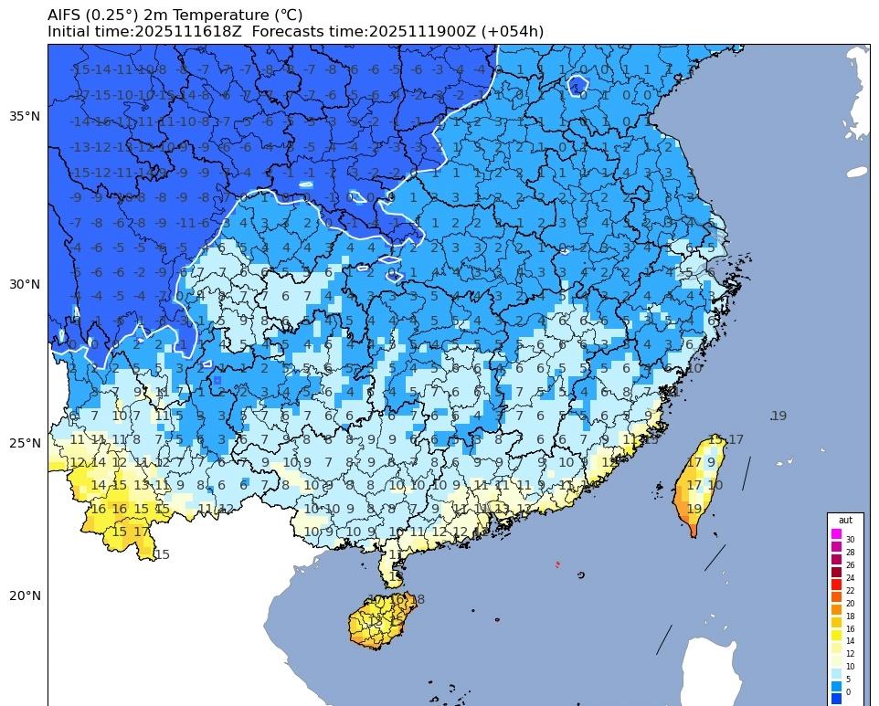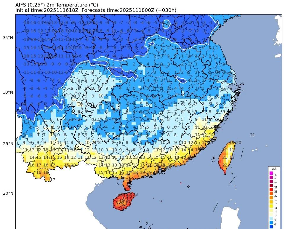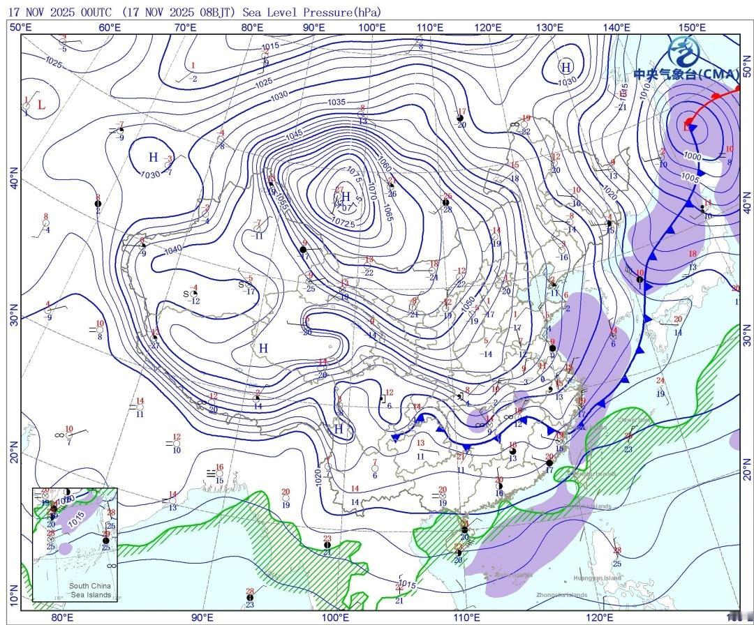 下半年以来最强寒潮真的来了!霜冻线南下至 11月17日上午,寒潮前锋已经抵达四川盆地东南部-湖南中南部-江西北部-福建北部沿线,华北中南部、西北地区东南部、江汉江淮黄淮地区出现6-10℃降温,局地降温14℃以上。未来寒潮前锋继续南下,今晚将抵达华南沿海,届时中东部大部分地区将北风呼啸,来自西伯利亚的寒冷气流将直抵南海。 受寒潮影响,11月18-19日夜晨中东部大部分地区将出现下半年以来最低气温,最低气温0℃等温线将南下至四川中部-陕西中南部-黄淮地区北部一线,霜冻线将南下至江南丘陵中部,10℃等温线也将直逼华南沿海。寒潮
