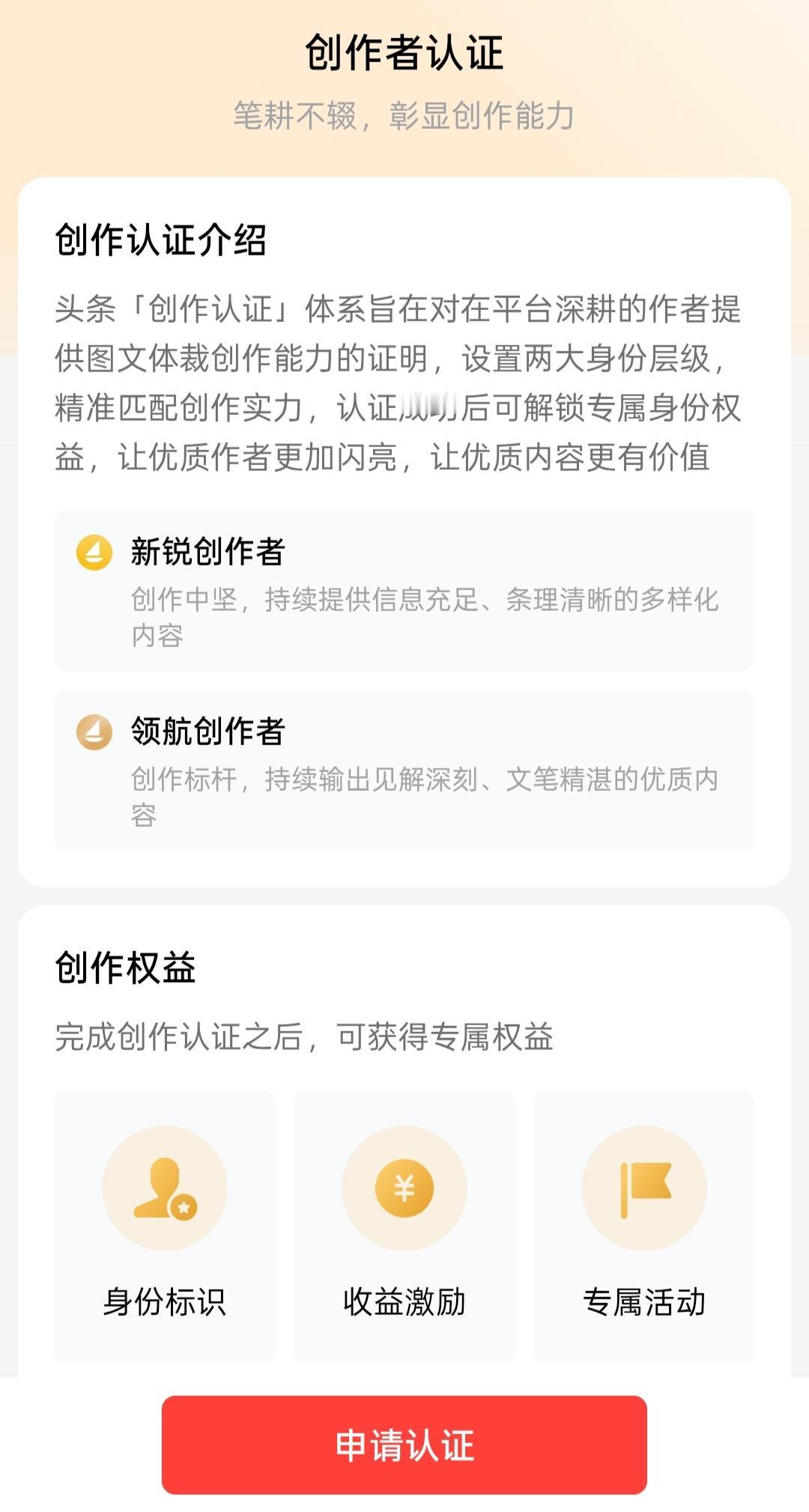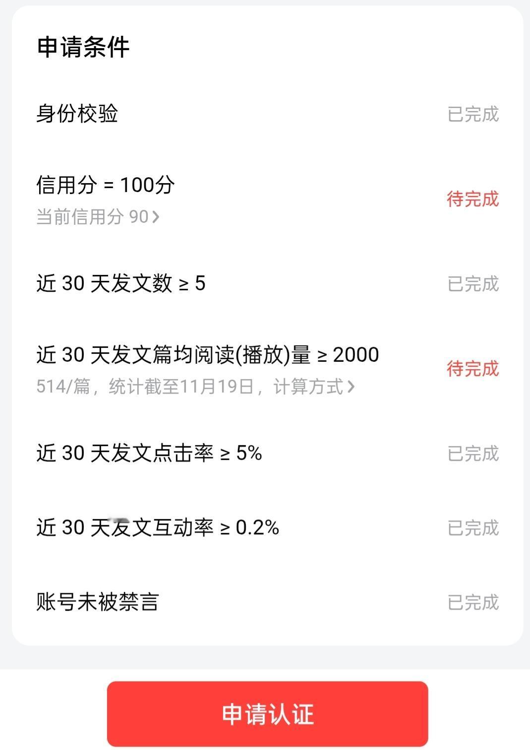 新锐创作者申请条件又增加了一个, 近30天的发文阅读量均大于2000。 对于新星创作者来说, 难度可谓是不小。 可能是头条在卡申请的人, 让我们这种流量看天意的不能申请。 不知道是不是新锐创作者申请成功以后 流量会不会是要好一些呢? 增加了这个条件以后,不知道什么时候才能申请新锐创作者。只能慢慢来吧 新锐创作者困境