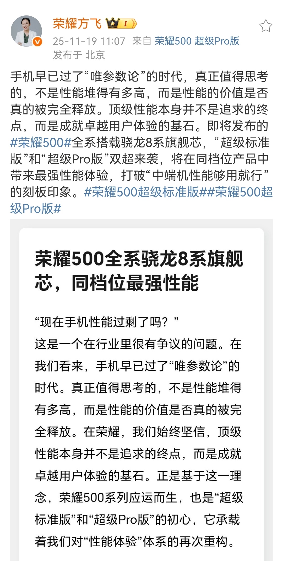 毫无疑问,中端机最不能妥协的就是性能吧。因为手机本身的定位和价格放那了,相比旗舰机,很多配置都会有一定的减法,那性能就是这款手机体验上限的基础性配置。这次荣耀500系列的性能配置就很激进,全系搭载骁龙8系旗舰芯片,标准版用骁龙8s Gen4,Pro版用顶级的骁龙8 Elite,这在同档位属于顶尖配置了,而且对用户的使用体验肯定是个极大的保证。现在就很好奇,荣耀500系列会如何定价,拭目以待!