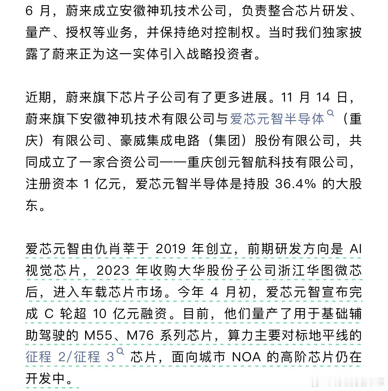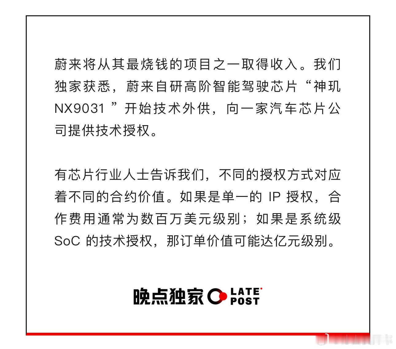 蔚来神玑NX9031芯片首次技术外供,将向一家汽车芯片公司提供技术授权。————这里蔚来神玑公司的角色算是Tier 2,爱芯元智及关联资本占合资公司52%,蔚来和豪威的股份加起来则占比48%,蔚来方面主要赚的是神玑芯片授权的钱,合资公司应该主要还是爱芯元智做主导,这应该算是让专业的人继续办专业的事。——之前爱芯元智主要做一些基础入门方案,接下来对于高阶市场则通过神玑来切入,毕竟研发大算力芯片的费用还是有点大,神玑是比较快能量产且已经过市场验证,而神玑芯片蔚来也有外供赚点钱的需求。