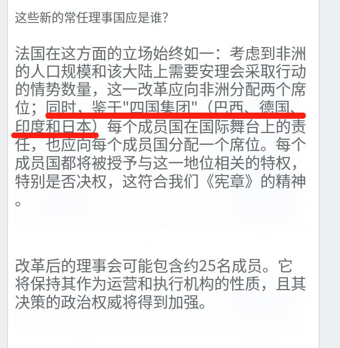 法国又在联合国发表声明为印度“撑腰”了,表态支持印度成为安理会常任理事国,还附带一张“否决权”门票。 同时,法国还支持其他四国集团成员—日本、德国和巴西,并支持非洲获得两个席位。 恕我直言,法国支持印度入常,背后还是因为利益,例如阵风战机的销售问题,这是法国不可能放下的,为了将阵风战机销售,法国甚至默认允许印度的阵风战机挂载核弹。至于支持德、日、巴西都是陈腔滥调,这次法国还支持非洲获得两个席位,还是在替自己考虑,大家都清楚法国在非洲的影响力,法国只是在替自己谋求利益罢了。 要我说,法国既然这么支持印度等国入常,不如把自己的席位让出来,否则,喊再多名字,也只不过是一场外交表演罢了。 新闻来源:印度外交事务助理编辑西巴特·西巴尔(11月19日)