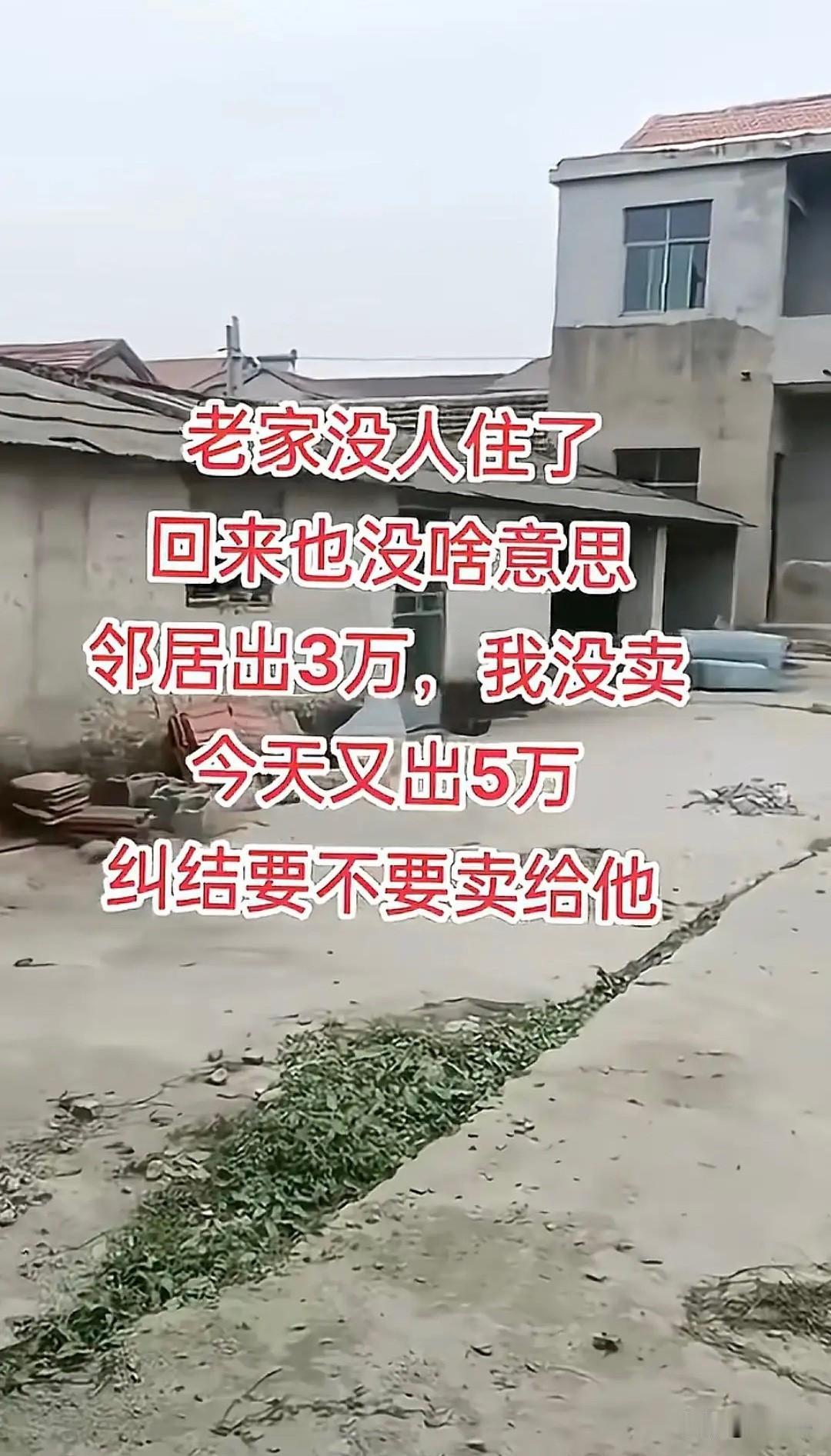 老家早没人住了,现在回去也没啥念想。之前邻居出三万想买,我没舍得。结果今天又找上门,直接开到五万,我这会儿正犯嘀咕,到底卖不卖啊? 别卖!真的,那些早前把农村老房卖了的,后来没一个不后悔的。这年头五万块算啥啊,根本不经花。再说了,谁知道以后城里会咋变,这老房子好歹是条退路,万一用得上呢?你没看现在好多城里老人,都乐意往农村跑,租个房养老多舒服。 卖了指定得后悔!农村这房子是咱的根啊,只要你还能走动,就别轻易卖。哪怕离得再远,隔个几年回去转一转、看一看,那也是咱跟爸妈曾经笑过、闹过,有过欢喜也有过愁的地方。爸妈不在了,就更念着这地儿了。 现在三五万真干不了啥大事,还是留着吧。家在,根就在。以后要是想通了,把房子翻修一下,等老了说不定真就想回去住了呢!
