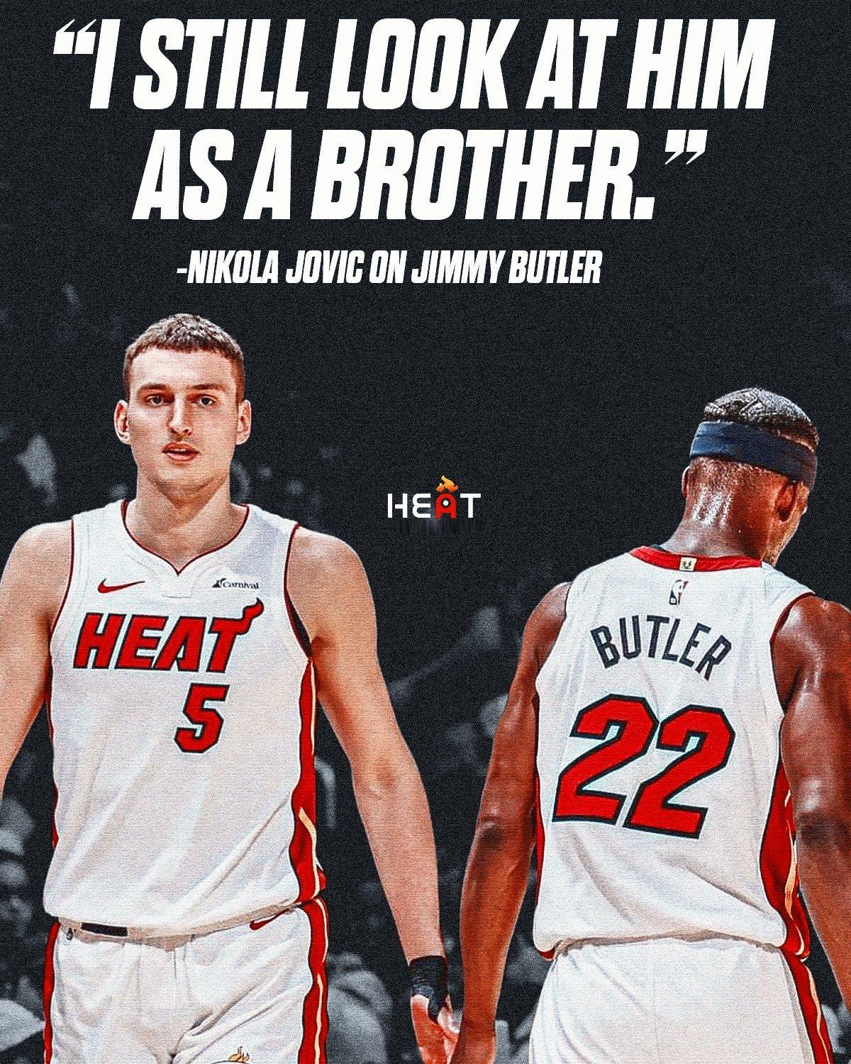 约维奇谈巴特勒❤️“我仍然把他当成兄弟,当成家人,我从他身上学到了很多。他帮了我很多,我想我永远不会说他的坏话。我仍然很敬仰他——他还在这儿的时候我就很敬仰他,他可以说是我的榜样。是的,一切都是爱。”