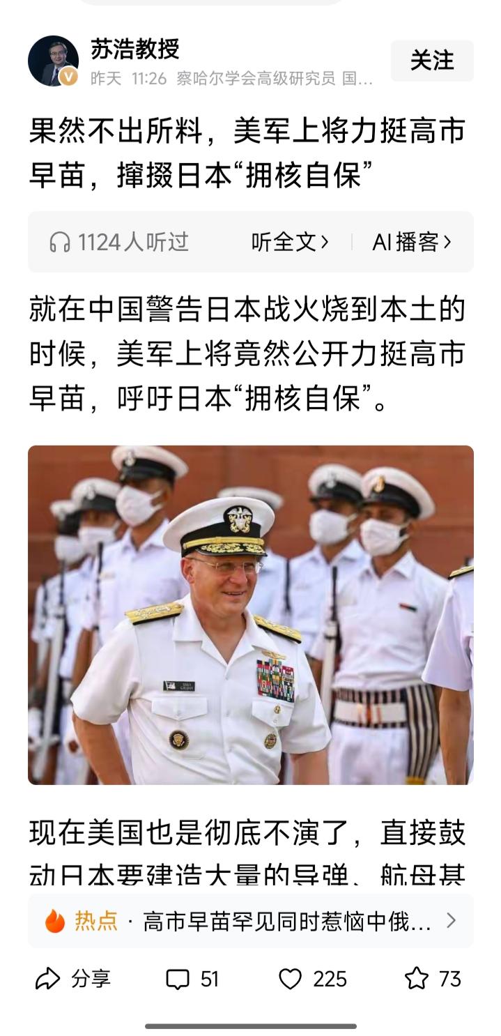 你认为高市早苗误判美日同盟了吗这个里尔·考德尔是蠢货还是傻瓜,以日本政客的纳粹民族主义心里,日本拥核首先会干掉美国……
