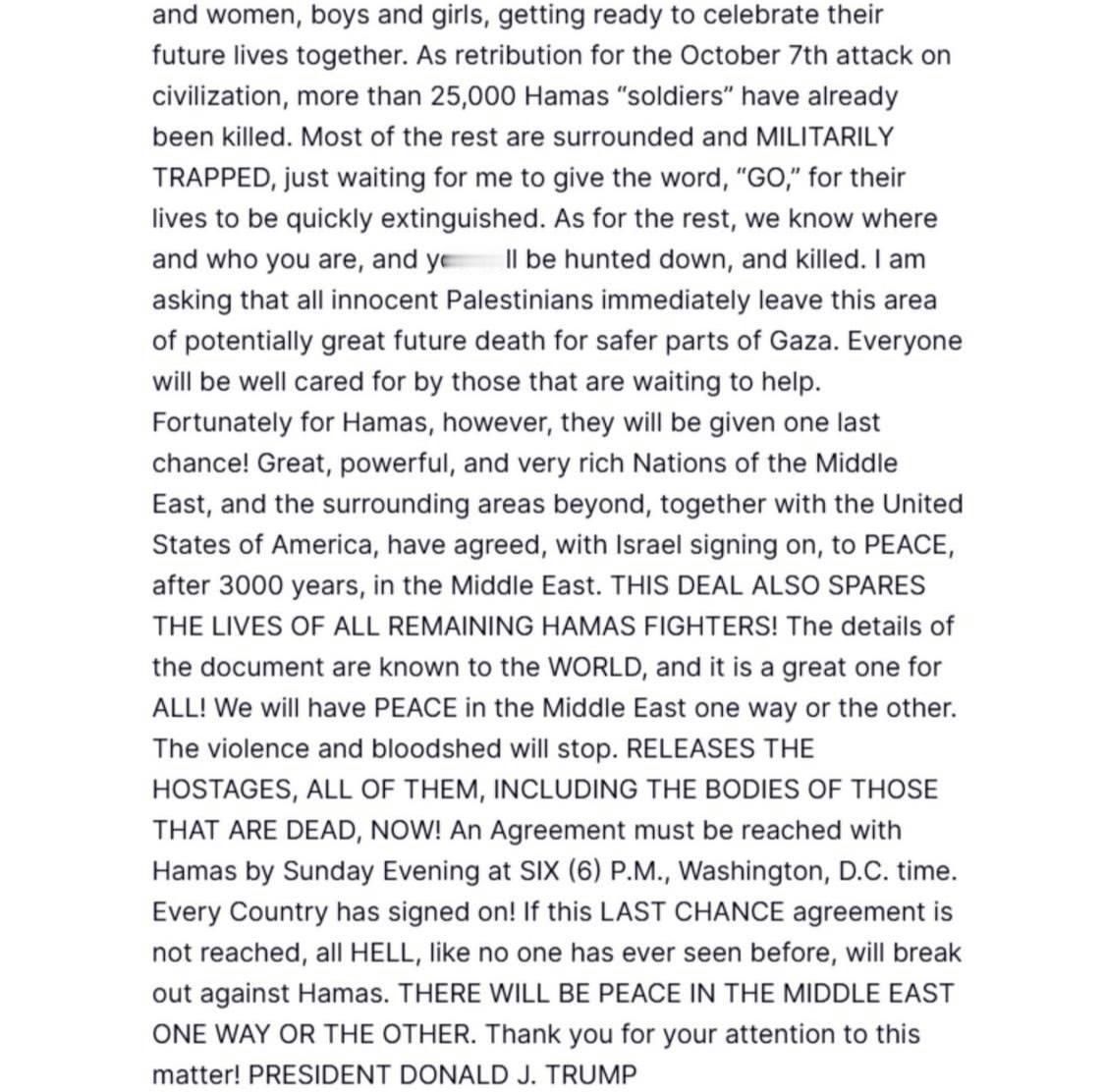 特朗普向哈马斯发出最后通牒。 特朗普在社交媒体平台“真相社交”上发文称:已有超过2.5万名哈马斯武装人员死亡,其余人员被困,正等待被剿灭的命令。 他说他哈马斯提供了最后一次实现和平的机会:一项得到美国、以色列及阿拉伯国家支持的协议,要求哈马斯在华盛顿特区时间周日下午6点前释放所有被扣押人质。 若哈马斯未能遵守,他警告称,“地狱将随之降临”,并表示:“无论如何,中东终将实现和平。”