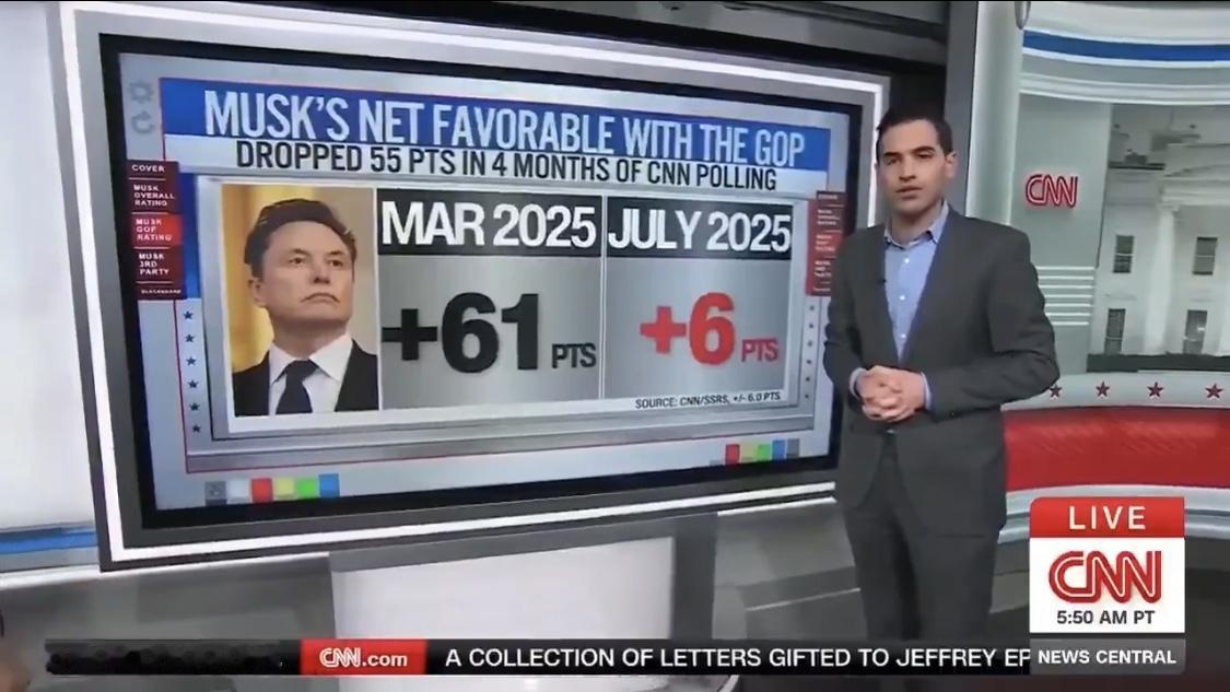马斯克成立第三党很可能胎死腹中。 CNN公布的民调显示: 马斯克本人的支持率:-37%。 反对马斯克成立第三党的支持率:74%。 马斯克在共和党内的支持率:4个月内,下降了55个百分点,从3月份的+61 %降至7月份的+6 %。