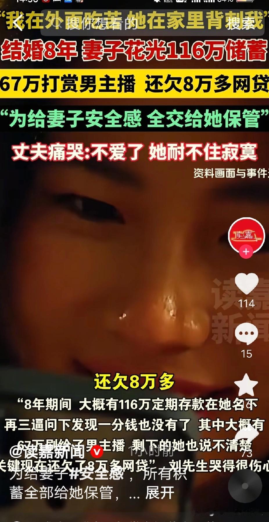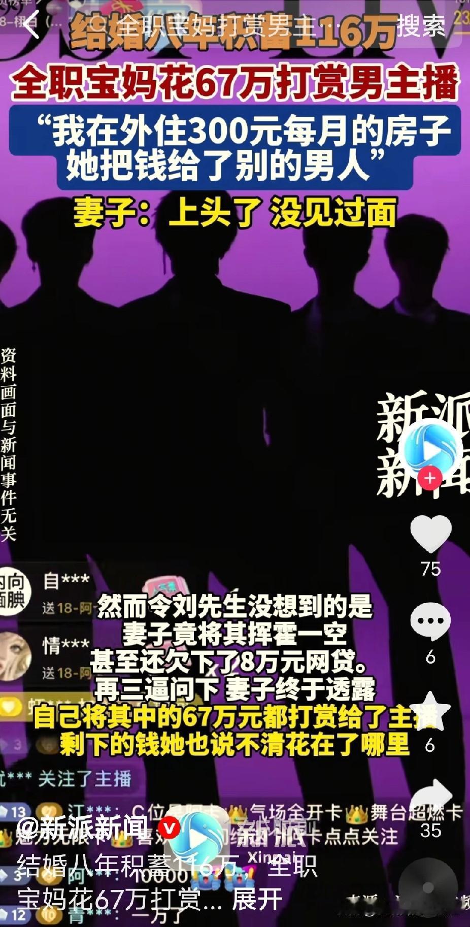 夫妻熬了十年攒的116万,刚要给孩子买学区房,结果妻子一句话,全家懵了! 男主播一句“姐姐你最懂我” 她刷10个嘉年华;主播说“冲榜差一点”,她直接转20万,67万打赏,还欠8万网贷! 刘先生蹲在医院走廊,捏着只剩三毛钱的银行卡,眼泪止不住地往下流。这位长年在外打工的汉子,自己租住月租300元的漏雨小屋,把辛苦赚来的血汗钱全部交给妻子保管,一心想着未来给孩子买学区房,给老人备着救命钱。他怎么也想不到,妻子竟然把全家人的未来都刷给了屏幕那头的陌生主播。 妻子也委屈得直抹眼泪。她每天围着孩子锅台转,社交圈越来越窄,心里空落落的。男主播那声“宝宝”叫得她心动,直播间的追捧让她找回了久违的存在感。从几块钱的小礼物到上万元的“嘉年华”,她明知道不该却停不下来——那种被众星捧月的感觉像毒品一样让人上瘾。 这场悲剧撕开了婚姻里最隐蔽的伤疤。丈夫以为把钱全上交就是爱的全部,却忘了妻子需要的是情感陪伴而非仅仅是经济供给。直播间里精心设计的PK机制、暧昧话术,正好击中了全职主妇情感空虚的软肋。当现实婚姻缺乏温度,虚拟世界的“关怀”就成了致命诱惑。 事情曝光后,刘先生想追回打赏款却困难重重。尽管法律界人士指出,妻子擅自处分大额夫妻共同财产,配偶有权主张返还,但现实中举证难、平台协议规避等因素让维权之路充满荆棘。即便胜诉,可能也无法全额追回损失。 虚拟世界的烟花再绚烂,终究照不进现实的一地鸡毛。主播喊一千句“姐姐”比不上丈夫一句真诚的关心,榜一大姐的虚名换不来孩子的学费和老人的医药费。婚姻需要两个人共同掌舵,而不是一个人在现实里拼命划船,另一个人却在虚拟世界里凿洞。 各位读者你们怎么看?欢迎在评论区讨论。