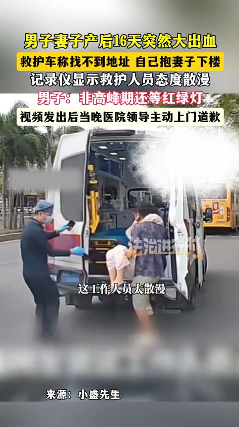 “严查到底!”近日,广东深圳,一女子在家突然大出血,老公焦急的叫了救护车,不料,对方却表示找不到地方,男子只能抱着妻子到小区门口等,没想到,赶来的护士却十分散漫,站在一旁无动于衷!网友:这是拿生命当儿戏。 救护车属于特殊车辆,在紧急情况下,是可以闯红灯的,因为每省出一秒钟的时间,病人生存的几率就会多一分,所以驾驶救护车的司机一定要经验丰富,熟悉各路段的状况,医护人员更要专业。 据媒体11月18日的报道,当时盛先生在家陪妻子,妻子刚刚生完孩子16天,身体还比较虚弱,盛先生想要尽可能的照顾好她。 然而,意外还是发生了,妻子突然大出血,盛先生慌忙中立即拨打了120,然而,司机在联系他时,却表示不知道具体位置,没有办法,盛先生只能自己将妻子抱下楼,并带到小区门口等车。 救护车驶来后,医护人员从车上缓缓下来,不急不慢的朝他走来,另一人在打开半扇车门后就一直站着不动,就连盛先生抱着妻子过来时,都没有打开另外半扇门! 事后,盛先生觉得这些医护人员太不负责了,对待工作非常散漫,要知道这可是关乎人命的大事啊,于是就将视频发到了网上,当晚就有该院的领导上门道歉。 网友看后表示,医生的本职就是治病救人,面对病危的病人如此懈怠,岂不是太说不过去了?一定要好好批评教育,做出整改。 信息来源:《男子妻子产后16天突然大出血,救护车称找不到地址,自己抱妻子下楼,记录仪显示救援人员态度散漫,视频发出后,当晚院领导主动上门道歉》法治进行时