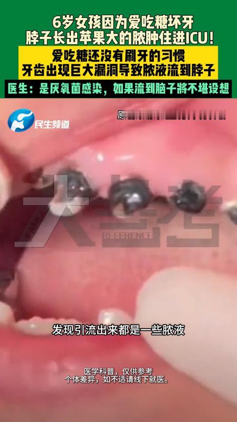 “悲剧还是发生了!”11月17日,河南郑州,6岁女孩特别爱吃糖,平日里却不刷牙,结果时间一长,牙齿全都坏掉了,嘴里的脓液更是流进脖子,医生检查后发现是厌氧菌感染,如果流到脑子里将会有生命危险!网友:家长心真大啊! 孩子作为一个家庭的延续,自出生起那就是家里的掌上明珠,父母对于孩子可以说是百依百顺,提的要求全都满足。但一味的宠溺孩子并不合适,尤其是在饮食方面。 据了解,这名小女孩平时非常喜欢吃糖,而家长为了满足孩子的需求,总是不断的给他买糖吃,但是女孩却没有刷牙的习惯,久而久之,牙齿就有了蛀虫。 可是家长并没有太在意,似乎只要孩子不哭闹就没事,随着时间一天天的过去,女孩牙齿的情况已经不容乐观,蛀牙出现了大漏洞,导致脓液不断囤积在脖子中。 没多长时间,女孩的脖子就肿了起来,这时孩子家长才意识到不对劲,于是慌忙抱着孩子去医院检查。 医生讨论过后,立即为女孩准备了手术,先将脓液清理干净,随后修理坏掉的牙齿,值得庆幸的是,这些脓液没有向上流,万一进到脑子里,就可能引发脓毒性休克,那可是会危及生命的! 小孩子不懂事,吃东西没有节制,找到好吃的就想一直吃,家长看到后一定要及时纠正,只有养成良好的饮食习惯,才能拥有一副健康的身体! 信息来源:《11月17日,河南郑州。六岁女孩儿因为爱吃糖坏牙脖子长出苹果大的脓肿住进icu。爱吃糖还没有刷牙的习惯,牙齿出现巨大漏洞导致液流到脖子。医生:是厌氧菌感染,如果流到脑子后果将不堪设想。》大参考