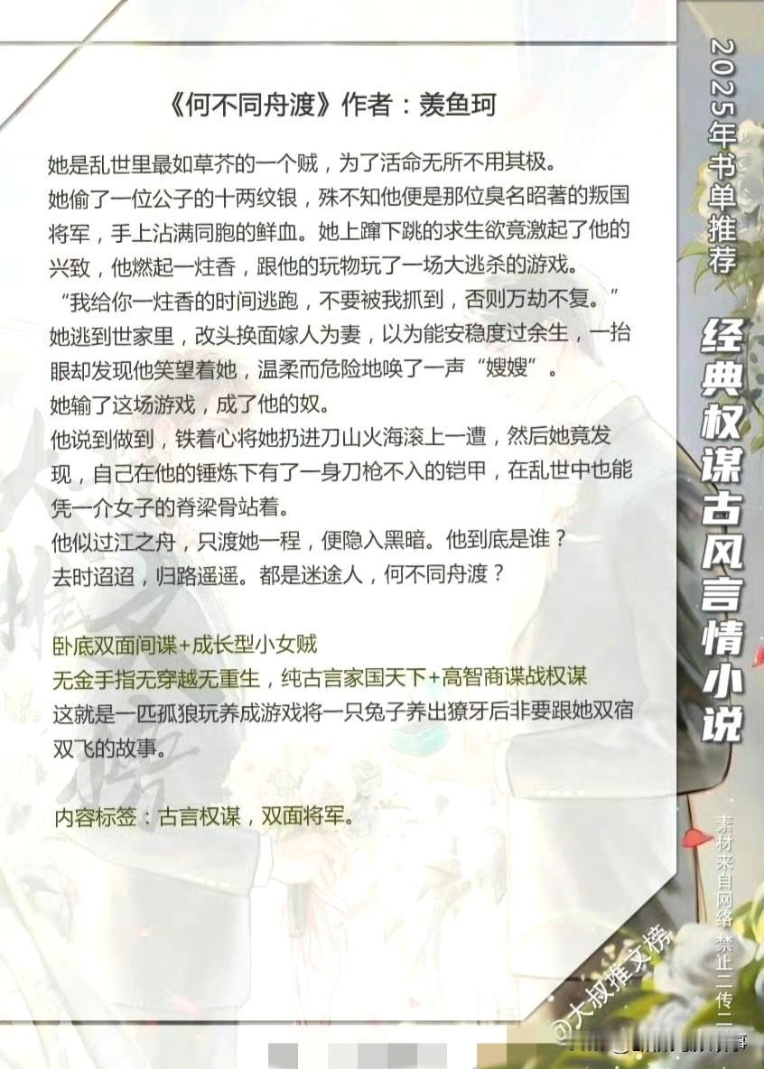 《何不同舟渡》:檀健次+卢昱晓+杨文军,这配置有点东西! 檀健次演“腹黑将军”适配度直接拉满——古装扮相自带贵气,冷感眼神刚好贴“叛国将军”的危险感;卢昱晓的清冷长相,演“求生小女贼”的倔强感也很贴,就盼着她再瘦点,和檀健次的体型差能更戳人~ 加上杨文军导演(《鹤唳华亭》的质感不用多说),原著“孤狼养兔”的权谋拉扯感,大概率能拍出又虐又苏的张力,这波配置先码住了!