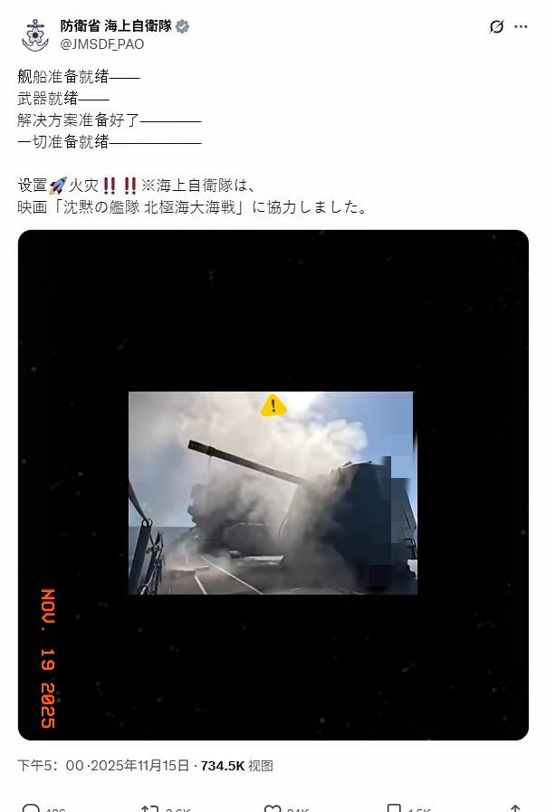 日本自卫队:一切准备就绪,开火! 所以说,高市早苗的挑衅言论压根不是什么无脑政客“独走”,而是日本社会从上到下试图复活军国主义思想、突破战后秩序的直接表现。 11月15日,日本海上自卫队官方账号,发布了一段军舰实弹射击的视频,并配文: “舰艇就位、武器就位、开火”——这喊得比电影台词还嚣张,最后补一句“拍电影”,简直是欲盖弥彰。 中日关系正紧张,高市早苗刚放话要武力介入台海,海自就来这么一出,谁信是单纯拍戏? 看看评论区日本网民的叫好声,全是“打败中国”的叫嚣,这已经不是隐晦试探,而是明目张胆的挑衅了。 但他们怕是打错了算盘,真以为现在还是几十年前?这种主动送上门的“清算机会”,中国人民巴不得接着。 军国主义的野心从来藏不住,只是他们忘了,正义不会缺席,历史的账迟早要算。你觉得日本这波操作,是真有底气还是自欺欺人?