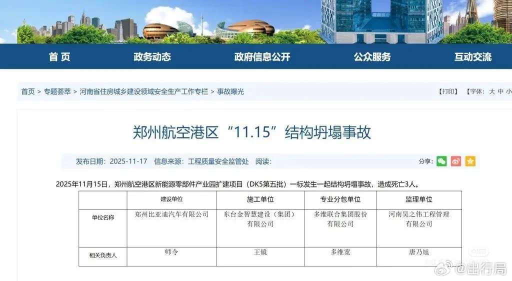 2025年11月15日,郑州航空港区新能源零部件产业园扩建项目(DK5第五批)一标发生一起结构坍塌事故,造成3人死亡。该项目建设单位为郑州比亚迪汽车有限公司,施工单位为东台金智慧建设(集团)有限公司;比较有趣的是,这次的施工单位东台金智慧建设(集团)有限公司曾用名为“东台金匠建设科技有限公司”,后者曾承担过比亚迪巴西的项目,并遭到过“巴西劳工”事件的非议