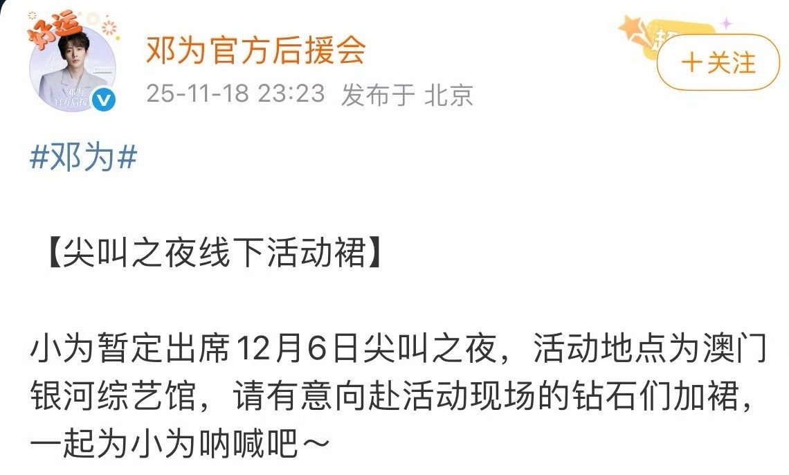 邓为确认出席12.6爱奇艺尖叫之夜,枯水期暂停