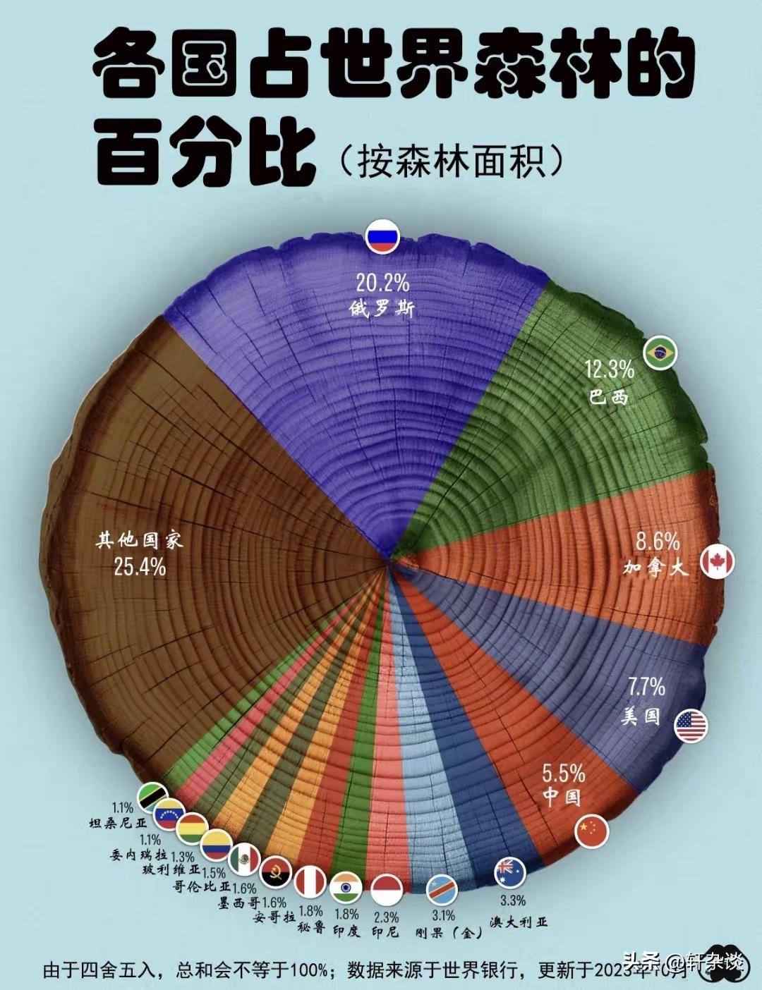 好有视觉冲击力的一张照片,各国占世界森林的百分比!各国的森林占比一目了然。 俄罗斯以20.2%的占比居榜首,巴西以12.3%占比次之,其次是加拿大8.6%、美国7.7%,中国以5.5%位列第五位,也算中规中矩。不过第五名已经是在意料之外,原想着在前十名会找不到我们的身影!算是意料之外。 不过澳大利亚以3.3%位列第六,实属意料之外,一直印象中的澳大利亚是戈壁、沙漠草原,主打一个干旱地带,竟然森林面积也排的上名号!看来那真是一大块“宝地”。