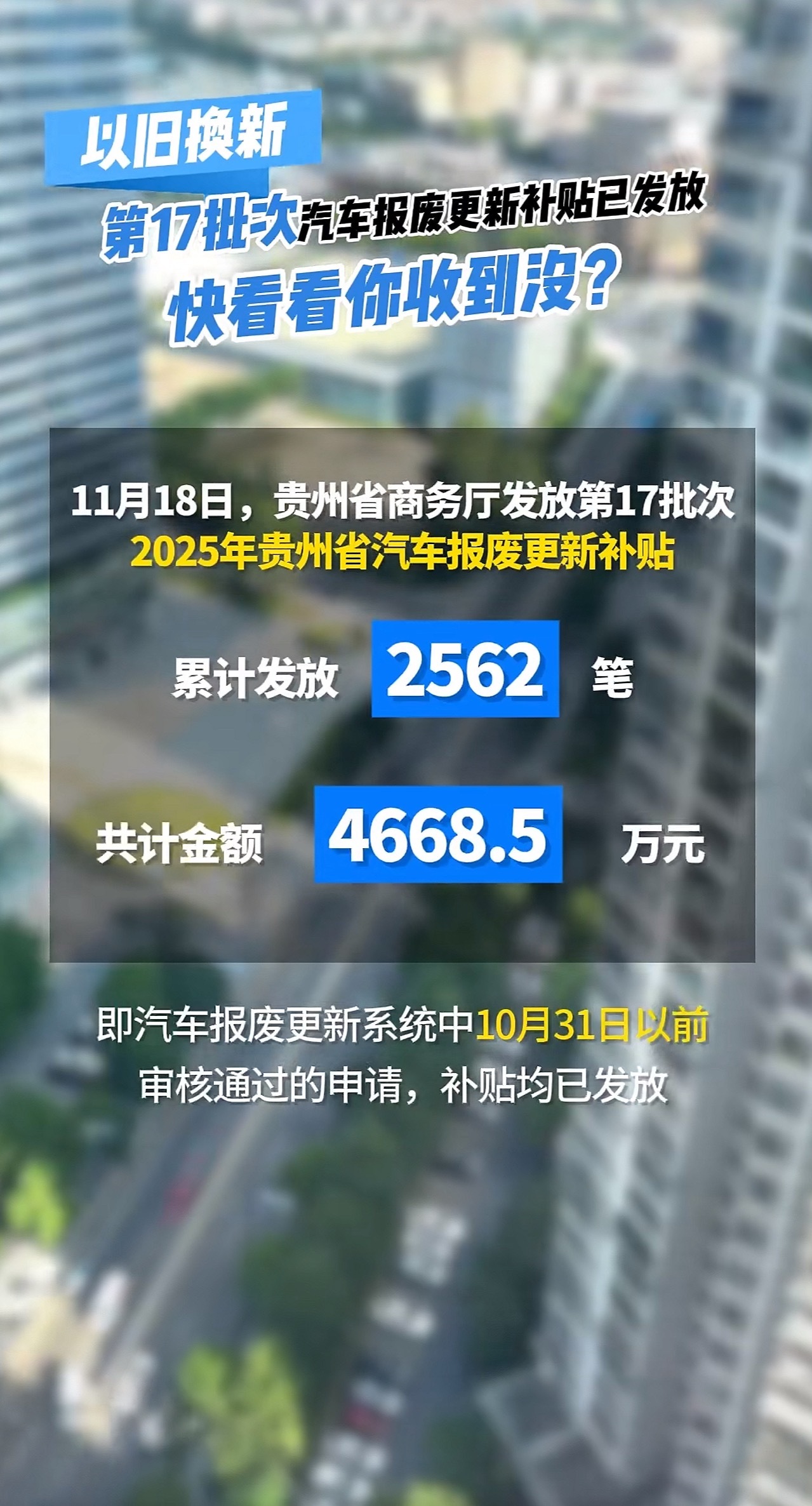 贵州省汽车报废更新补贴已发放到10月31日以前审核过的消费者手中!