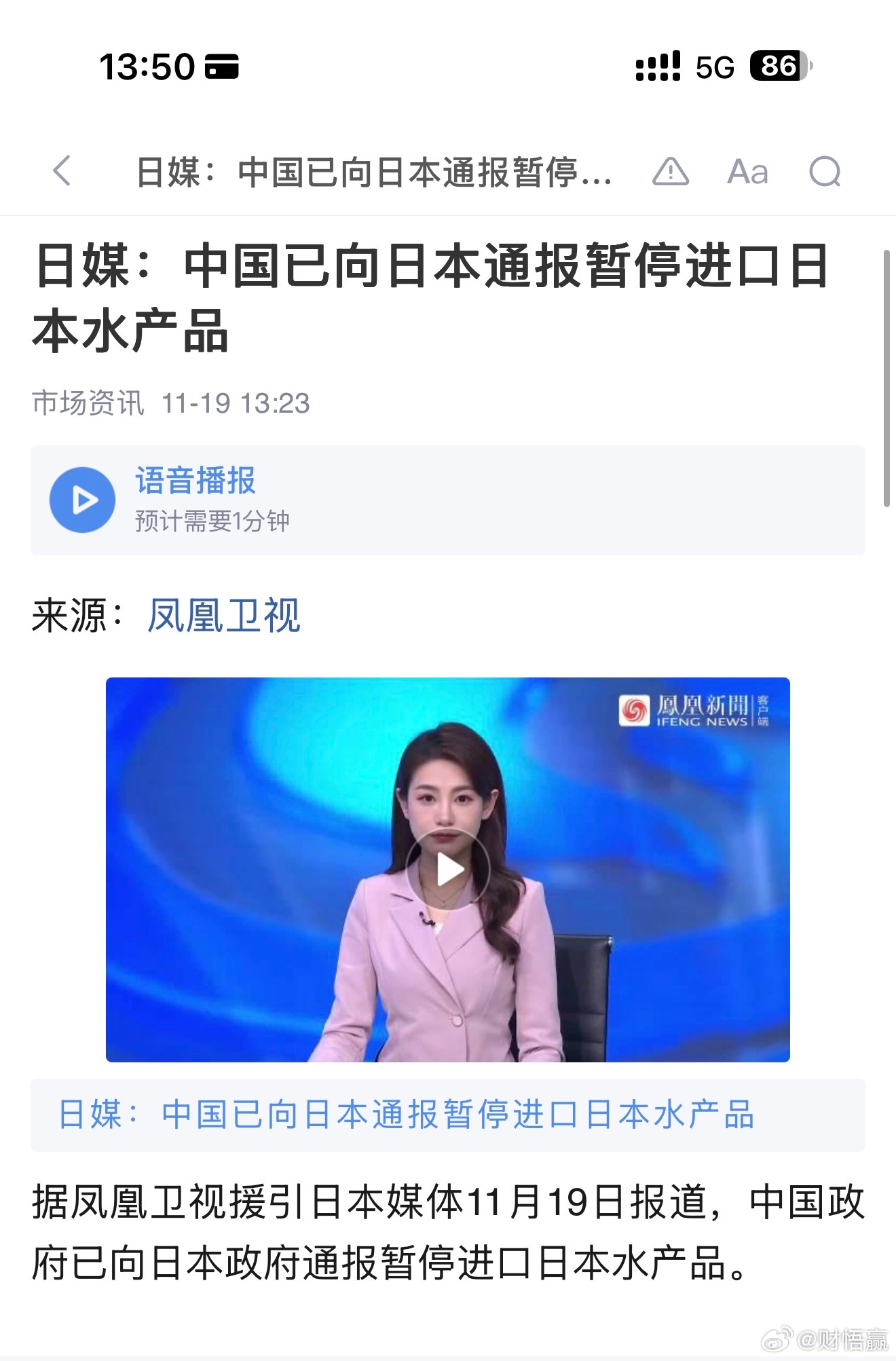 据凤凰卫视援引日本媒体11月19日报道,中国政府已向日本政府通报暂停进口日本水产