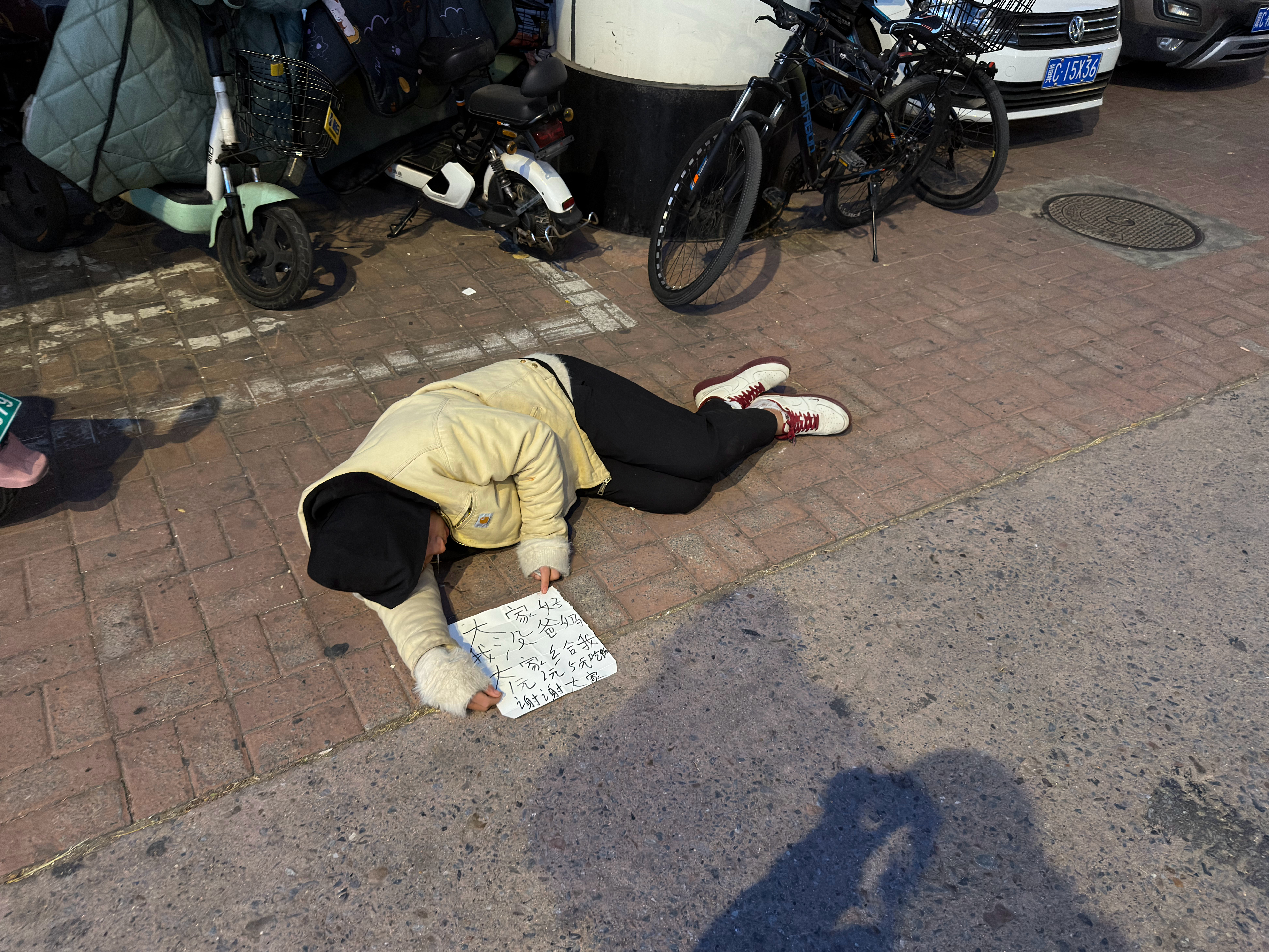 这哥们是不是在玩抽象啊?在这个位置躺了好几天了,我上下班路过都能看见,就这么躺着一动不动。写着是要钱,但是这样一分钱也要不到啊。他穿了一双Nike鞋,而且今天他还换了一天裤子,看着也不像很困难的样子。