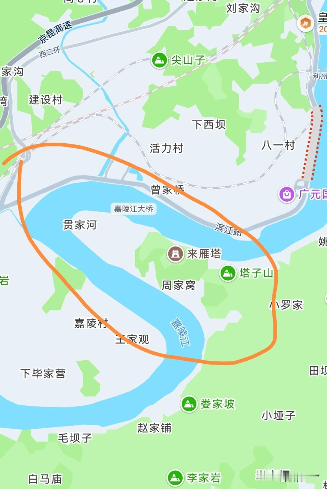 突然之间发现,广元城市边上有一个非常具有雄刚之气的半岛。这个地方开发出来应该是具有非常好的风水,千万不要在这里建桥梁。
