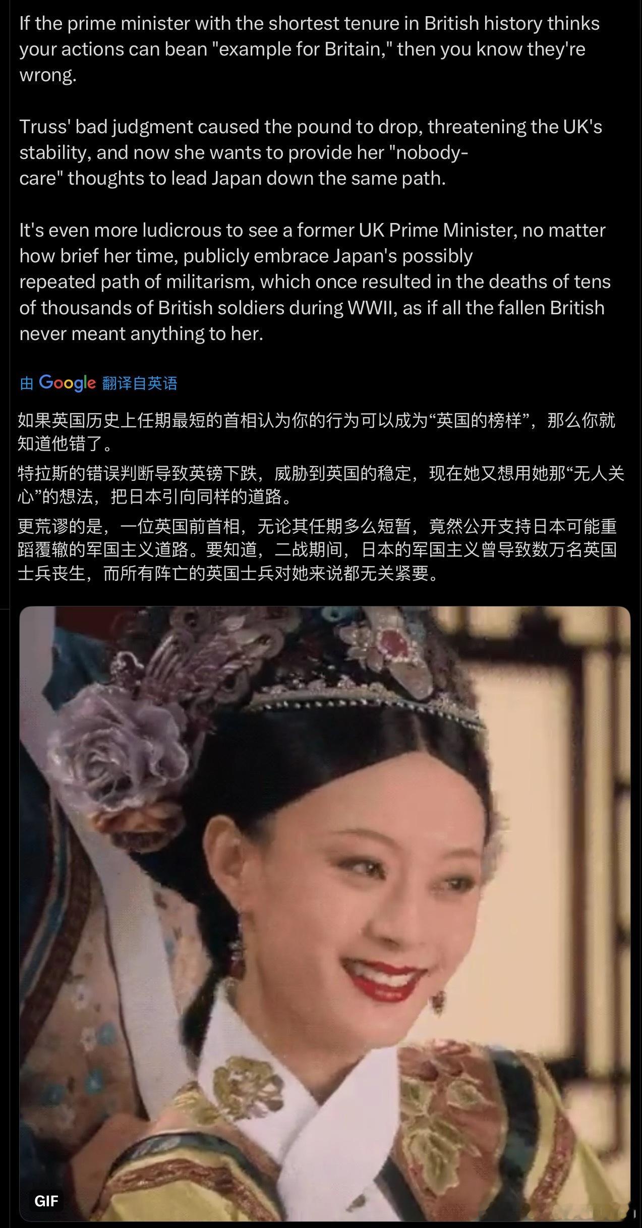 世界知名笑料,英国史上最短命首相栗子女士在社媒上跟高市早苗贴贴,说日本是英国的榜样东亚人民都很讲究风水运势的,栗子这种干了49天就下台的晦气前首相给高市早苗站台,这难道就是命运的安排更不必说日本军国主义给世界带来了的惨剧,英国人也深有体会。二战期间被日本法西斯屠戮的英国人不在少数,数典忘祖如栗子,也是没谁了。PS:日本和湾湾花大价钱就找来这些晦气的狐朋狗友给他们站台,也太可悲太可笑了