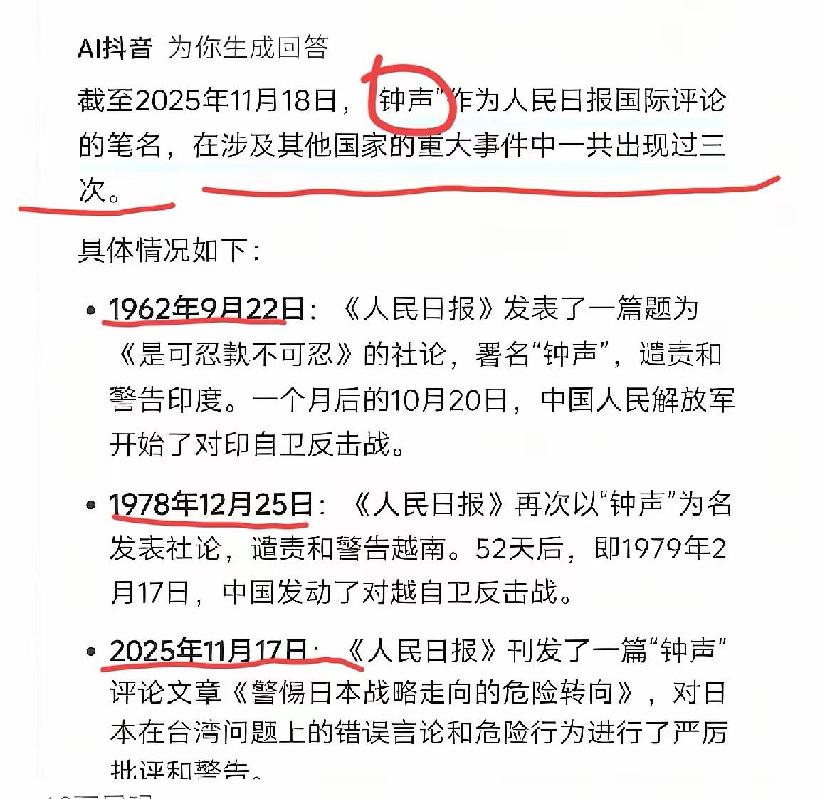 这样的钟声敲响的是中国之声。 这样的钟声敲响的是敌人的丧钟。 这次历史会重演吗? 如果历史重演,不希望再次退回来了! 就直接驻扎下来,让它再也翻腾不起来。