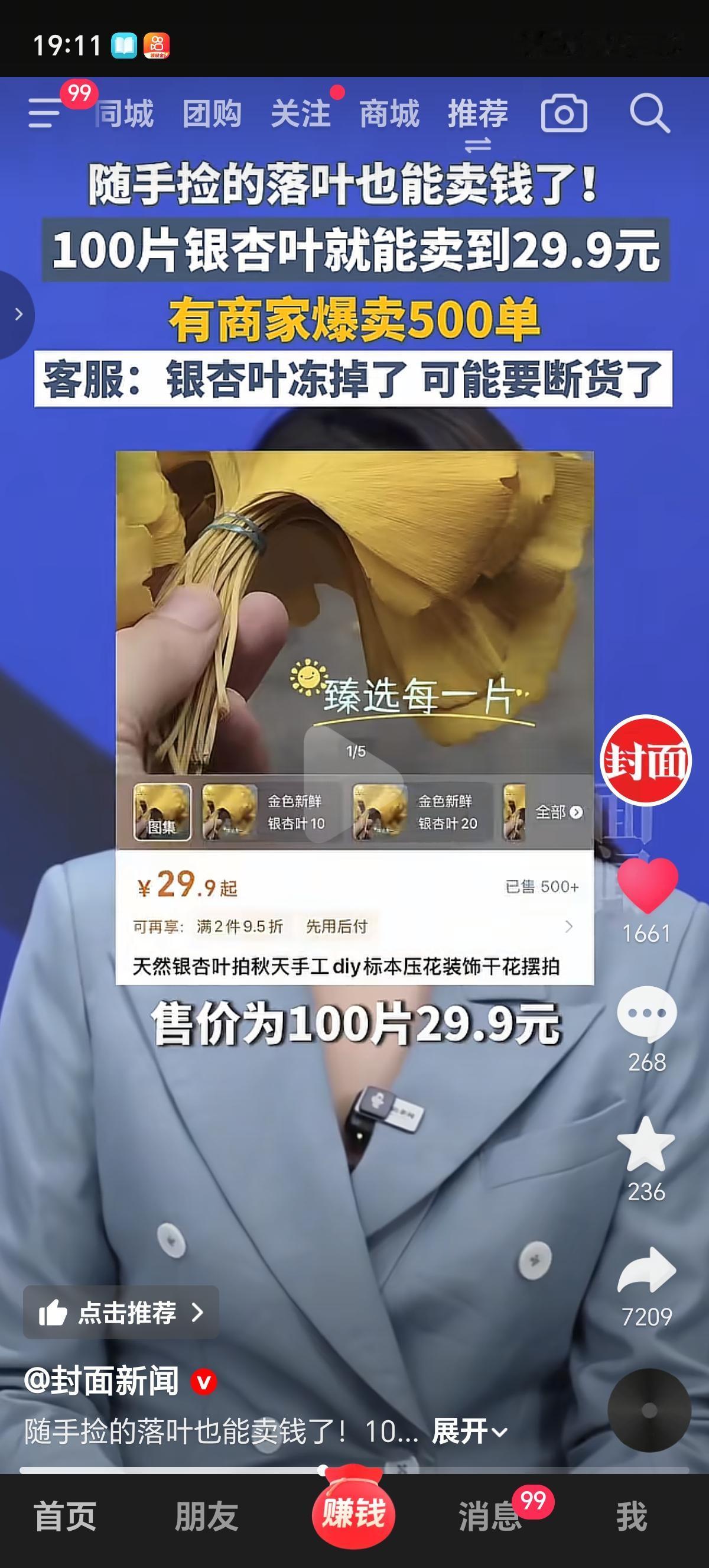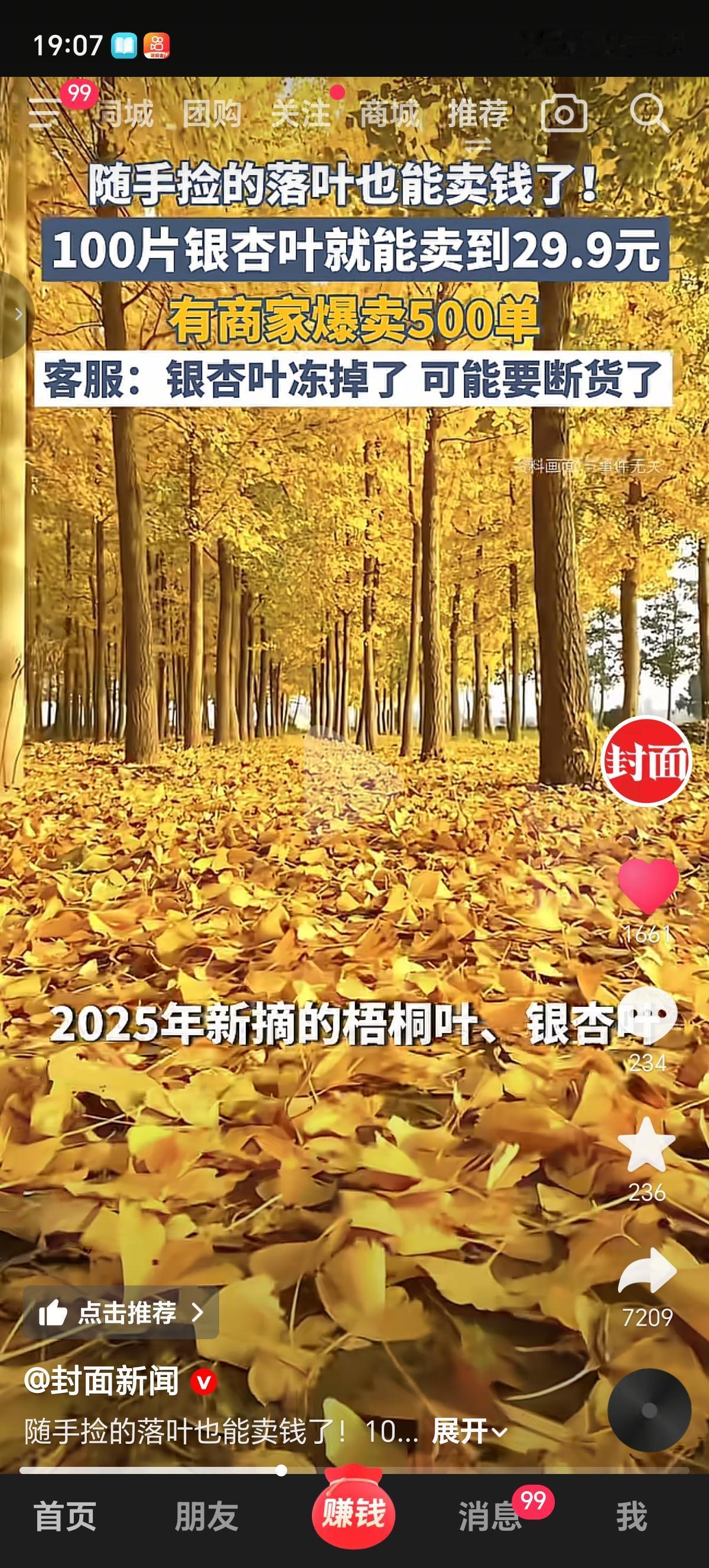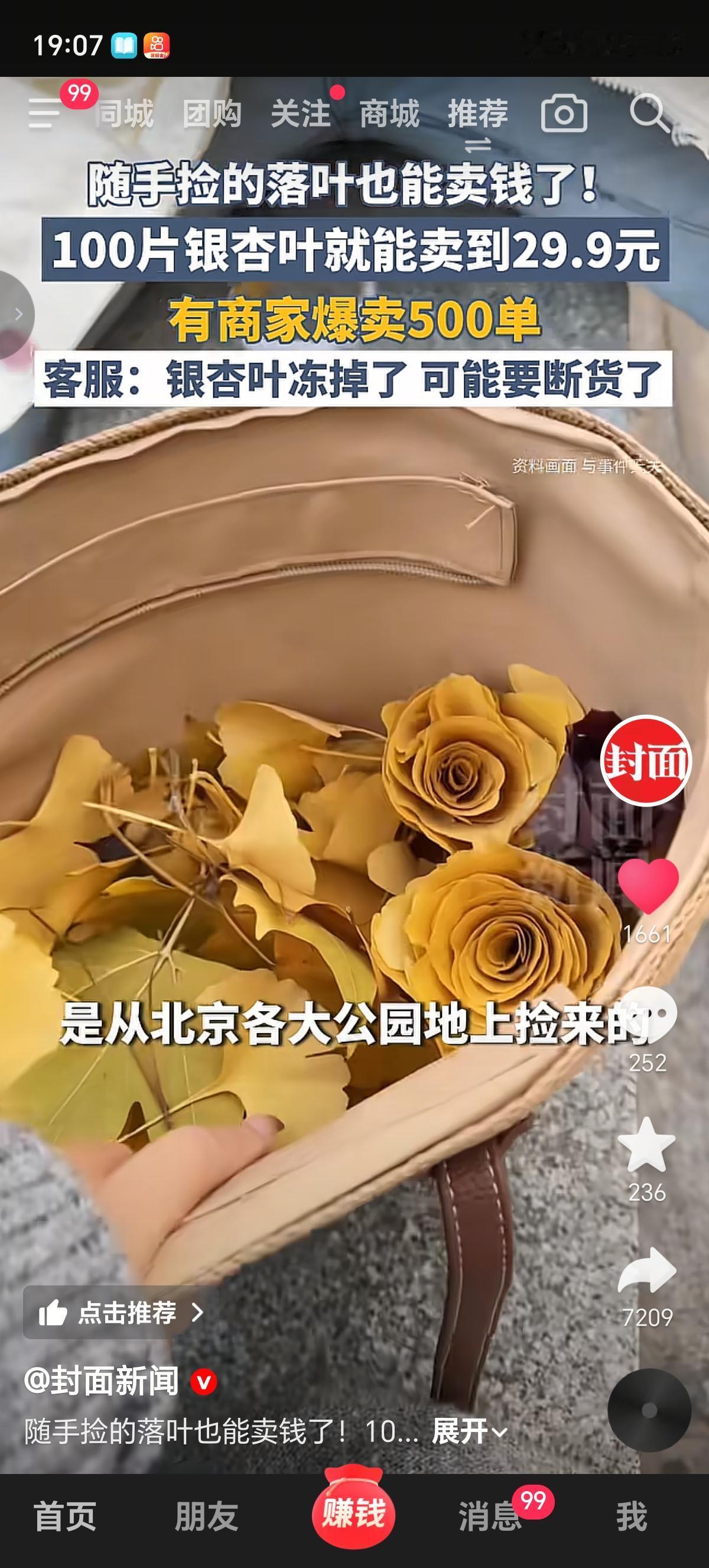 公园里捡树叶可以卖钱,供不应求,100片银杏叶29.9元,供不应求,快断货了。除