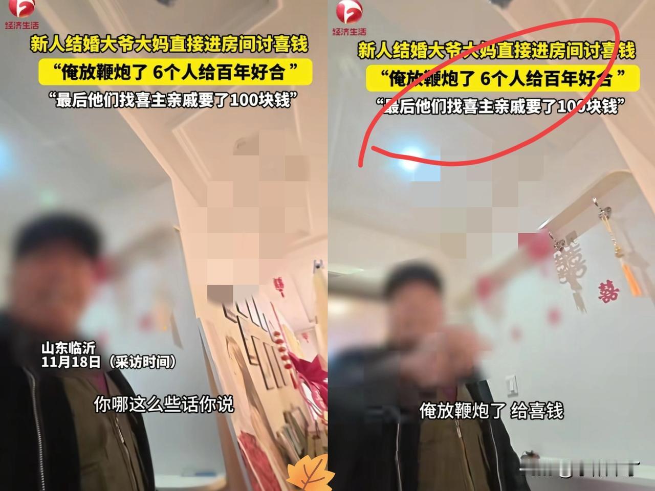“你跟抢劫有什么区别!”山东临沂,一对新人结婚,婚房里正满是喜气招待亲友,突然窜进来个陌生大爷,张口就堵着门要喜钱 主人家耐着性子劝他先出去等安排,老爷子倒好,直接说:不给喜钱,我今儿就赖这儿了! 婚庆管家赶紧上前打圆场,好言好语跟他说“赶喜有规矩,不能进屋堵着”,大爷一甩手根本不听! 旁边大妈也帮着劝说,让他听管事的安排,他反倒梗着脖子较劲儿:不用她管,我就等在这儿要! 忍到极限的女子当场炸了:不听安排就一分没有!你这哪是赶喜,分明就是抢劫!赶紧出去! 说真的,这哪是什么讨喜,纯粹是借着习俗当“遮羞布”耍无赖!喜钱是图吉利的心意,不是强取豪夺的“唐僧肉”! 倚老卖老闯私人婚房逼要钱财,既没规矩也没边界,纯属败人兴致的糟心事。谁家办喜事不是忙得脚不沾地?凭啥要给这种人消耗喜气? 喜庆从来都是互相尊重出来的,不是靠撒泼耍赖蹭来的! 大家对此有什么看法?