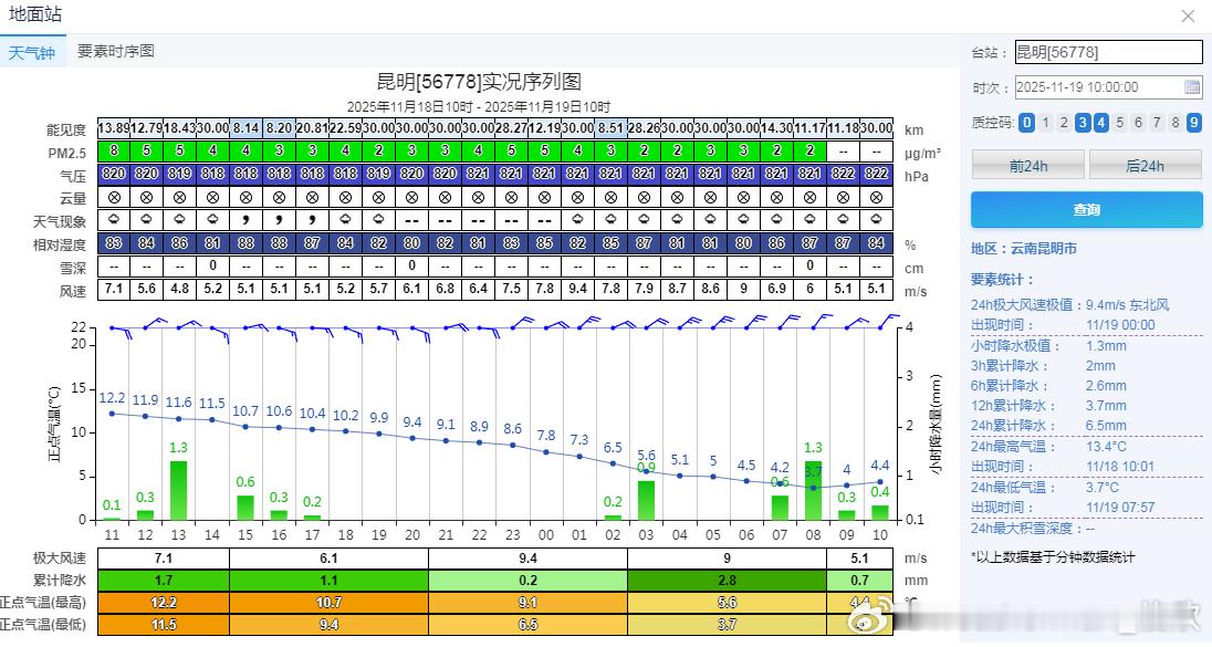从今天实况监测看,本轮寒潮南下程度以及深入云南的程度,都是同期少见的。冷空气向南,推进到了越南老挝柬埔寨和泰国,向西推到了云南西部。对应海平面的气压,1020百帕到了云南西部的边境一带,1030百帕进驻昆明。10时昆明实测地面气压为822百帕(有1800多米的海拔),反算海平面气压为1032百帕。通常1030百帕进入昆明会下雪,但因为这次是在11月,之前基础温度相对高,1030百帕到了,也尚未出现降雪,不过天气是非常阴冷。