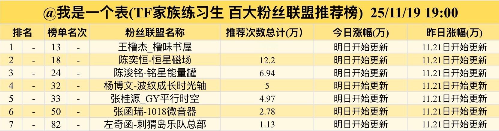 【TF四代】 截止19:00 🎀四代推荐值及榜单排名:王橹杰 > 陈奕恒 > 陈浚铭 > 杨博文 > 张桂源 > 张函瑞 > 左奇函