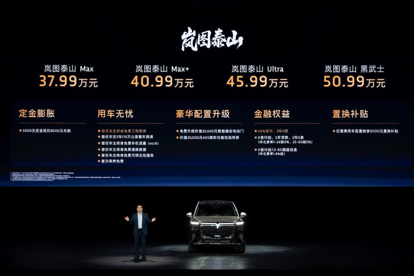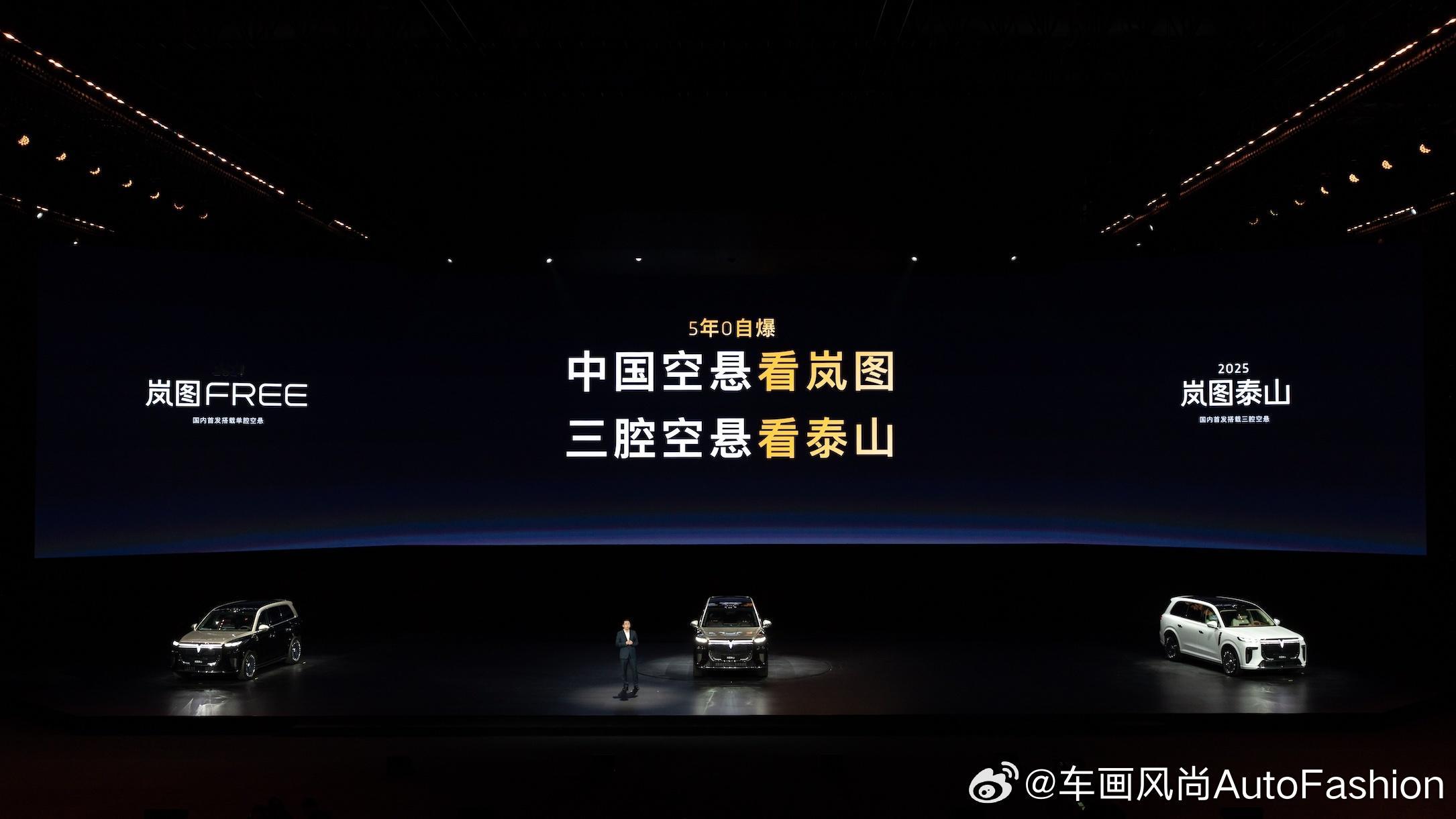 【大六座旗舰SUV岚图泰山上市,四款车型官方指导价37.99万元起】11月18日,主题为“争峰”的岚图泰山上市发布会在深圳举行。新车共推出Max版、Max+版、Ultra版、黑武士版四个版型,官方指导价为37.99万元-50.99万元。同时,还公布了价值48000元的上市首销期限时权益,以及包括专属交付礼遇、积分增值回馈、购置税无忧保障在内的尊享计划。底盘系统上,岚图泰山实现了中国品牌的历史性突破,其搭载的国产首发三腔空气悬架,此前仅应用于劳斯莱斯、库里南、保时捷Taycan等百万级豪车,岚图泰山是“世界第五、中国第一”配备三腔空气悬架的车型。相比传统单腔或双腔空悬,三腔结构提供4种刚度、5挡高度调节,结合EDC魔毯底盘与双向16°后轮转向,岚图泰山将过坎冲击度降低13%、余震收敛性降低40%,驾驶的平顺性提升40%,大幅提升驾驶舒适性。配合蟹行模式,转弯半径仅5.4米,操控灵活性堪比A级车。这一硬核配置,让“中国底盘调校不如欧美”的行业成见不攻自破。此外,岚图泰山还搭载了800V岚海智能超混系统,支持5C超级快充,全系标配65kWh大电池,在续航与补能效率上达到业界顶尖水平。岚图全系车型陆续搭载华为乾崑智能解决方案,让华为行业顶尖智能化技术与岚图硬核整车平台能力深度融合,获得用户与市场的一致认可。今年1-10月岚图汽车累计交付量同比增长82%,实现“九连涨”。截至今年10月底,搭载华为乾崑智驾系统的岚图车型,已实现1.45亿公里辅助驾驶里程,成功避免近4万次碰撞风险。值得一提的是,岚图泰山首批搭载华为最新、最顶尖的华为乾崑智驾ADS 4四激光方案,是真正的“满血版华为智驾”,硬件配置均达到行业顶尖水平,开创智能驾驶辅助与全维主动安全的新高度。 被动安全方面,岚图泰山以超五星级的安全标准打造,采用了高强钢铝车身以及2200MPa堡垒级门环,搭载行业唯一的双盾防撞加固车门、同级首款独家唯一电池包双重防护等行业领先安全技术,满足C-NCAP、E-NCAP严苛安全标准。日前,岚图泰山在中汽中心Top Safety极致安全挑战中,成功通过105km/h前后夹击、65km/h左右夹击、50km/h螺旋翻滚后柱碰等一系列严苛挑战,以超硬核实测表现,展现出其行业领先的高安全技术实力,打造豪华旗舰SUV安全新标杆。百万像素华为XPIXEL智慧投影大灯可呈现“鹏息迎辉”、“凤鸣九天”等定制灯语,同时具备礼让行人、导航光毯、露营投影等场景功能,让豪华更具情绪价值与仪式感。在空间与舒适性层面,岚图泰山以86.8%的得房率实现“六座平权”,第三排头部空间接近1米,AI云舒座椅拥有66颗传感器与26点按摩系统,将以往六座SUV第三排的妥协感彻底推翻。