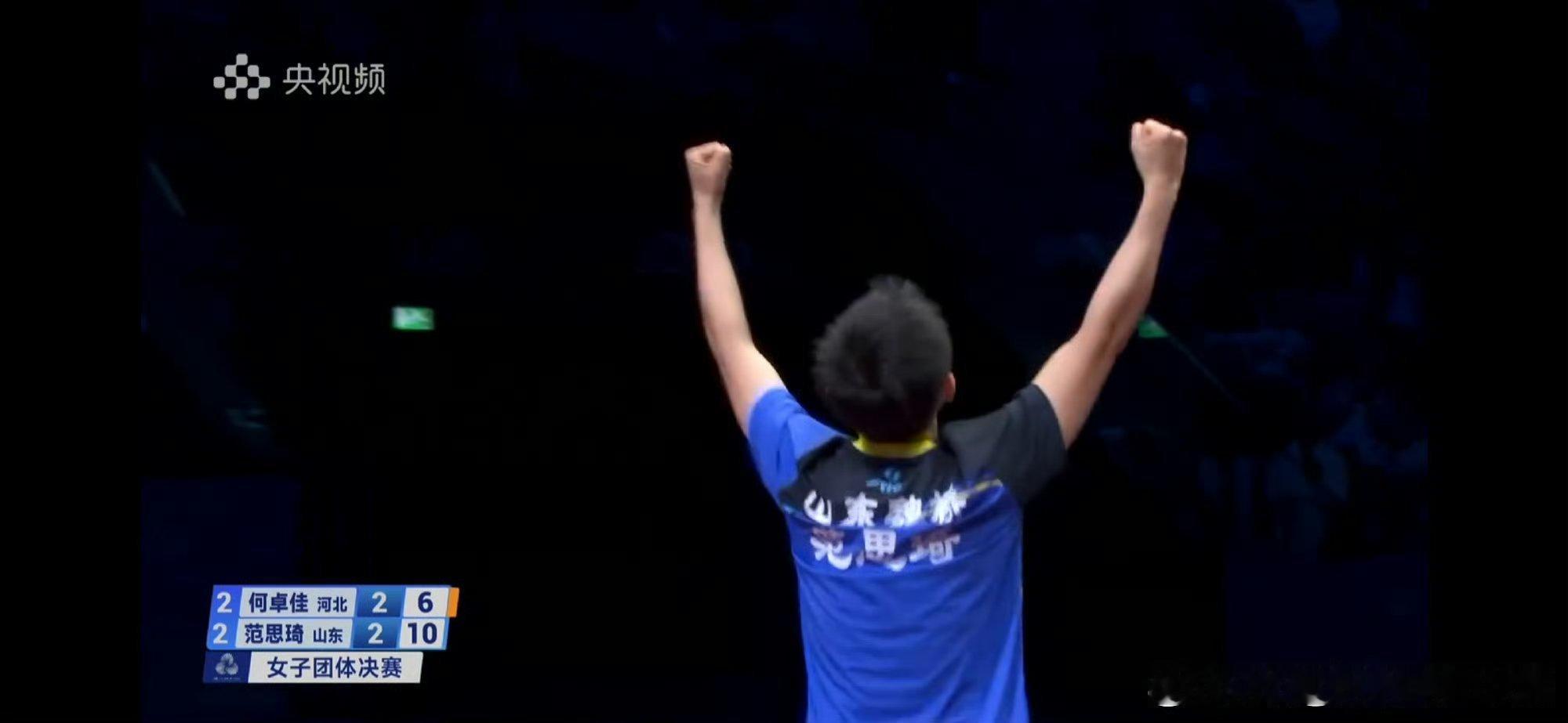 山东女团逆风翻盘!最后一盘范思琦对阵何卓佳!好可怕的范思琦,前两局输了,后三局赢回来!一开始好多人都以为何卓佳会赢!毕竟何卓佳2:0领先!后面三局硬是一局都没拿下!好可惜!很有可能是何卓佳体力不支,第三局开始明显进攻力不够强!范思琦心理也是够强大,输了两局还能逆风翻盘!