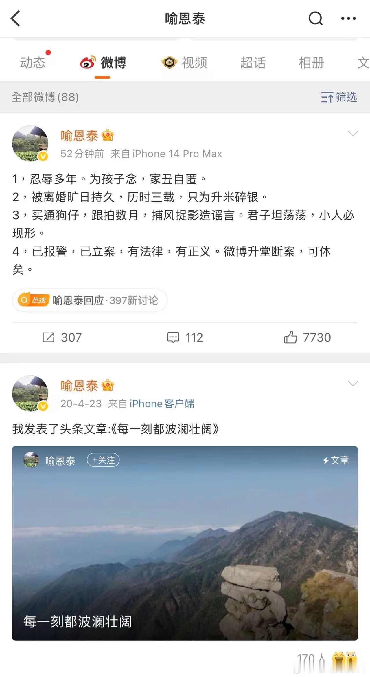 喻恩泰时隔五年再更微博是回应最近的婚变传闻,他的意思很简单∶ 离婚因为钱的事情闹了很久,自己一直没出来说是考虑到孩子,没想到史林子买通狗仔,跟拍自己和离婚律师互动造谣说“出轨”,目前这些猜测和舆论他已经报警立案,未来交给法律,还请不要微博升堂。