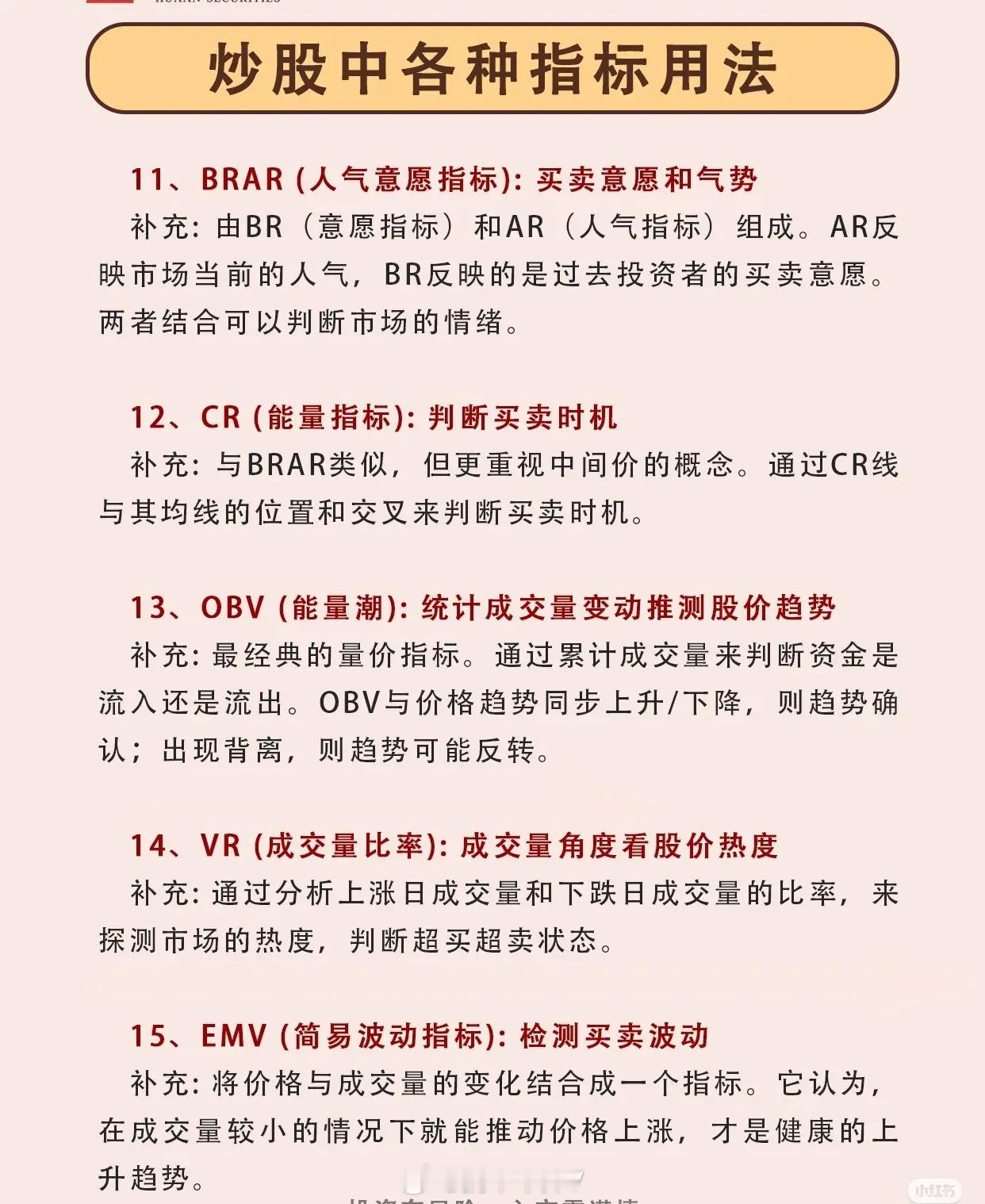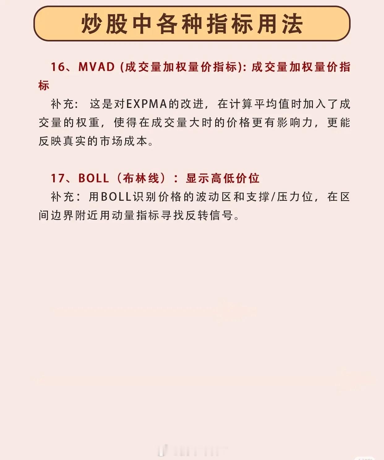 关于炒股常用技术指标用法的学习资料,共介绍了17种常见的技术指标,每种指标都附有简要说明,帮助投资者理解其用途和特点,以便在实际操作中辅助判断趋势、买卖信号以及市场情绪等。1–5. 基础趋势类指标:- DMA(平行线差指标):通过两条均线的交叉和方向判断趋势,较为简洁,适合看趋势。- MACD(指数平滑异同移动平均线):最核心的趋势指标之一,用于判断中长线趋势的强度、方向与转折(如金叉、死叉)。- TRIX(三重指数平滑平均线):专为捕捉长期趋势设计,信号稳定但略有滞后,能过滤短期波动。- DMI(趋向指标):不仅判断趋势,还通过+DI与-DI的交叉给出买卖信号,并利用ADX线判断趋势强弱。- EXPMA(指数平均数):对股价近期和远期数据赋予不同权重,比普通均线更灵敏,常作为动态支撑或阻力位。6–10. 震荡与超买超卖类指标:- ASI(振动升降指标):通过开盘、最高、最低、收盘价构造“幻想线”,用于更早确认价格趋势,判断价格真实性。- KDJ(随机指标):最常用的震荡指标之一,通过收盘价与价格区间的相对位置反映超买超卖,反应灵敏,适合短线交易。- CCI(商品路径指标):衡量当前价格与统计期间均价的偏离程度,用于发现强烈趋势的启动点,极端值时信号较强。- ROC(变动率指标):反映价格变化的速度(类似加速度),上升代表动能增强,下降则动能减弱。- WR(威廉指标):也是超买超卖指标,与KDJ类似但表现方式相反(0为顶部,100为底部)。11–15. 情绪、能量与量价类指标:- BRAR(人气意愿指标):由反映市场人气的AR和反映过去买卖意愿的BR组成,两者结合可判断市场整体情绪。- CR(能量指标):重视中间价,通过CR线与其均线的位置和交叉判断买卖时机。- OBV(能量潮):经典量价指标,通过累计成交量判断资金流向,若与价格趋势同步则趋势确认,背离则可能反转。- VR(成交量比率):通过上涨日与下跌日成交量的比率,探测市场热度,判断超买超卖状态。- EMV(简易波动指标):结合价格与成交量,认为小成交量推动价格上涨才是健康上升趋势,用于检测买卖波动。16–17. 改进型与综合类指标:- MVAD(成交量加权量价指标):在EXPMA基础上引入成交量权重,使大成交量时的价格影响更大,更真实反映市场成本。- BOLL(布林线):通过计算股价的标准差形成上下轨,用于识别价格的波动区间、支撑与压力位,可在区间边界配合动量指标寻找反转信号。总体来看,这些指标从不同角度辅助投资者分析股票走势,包括趋势判断、买卖信号、超买超卖、市场情绪、成交量分析等,可根据投资风格(如短线或长线)和策略需要选择合适的指标组合使用。