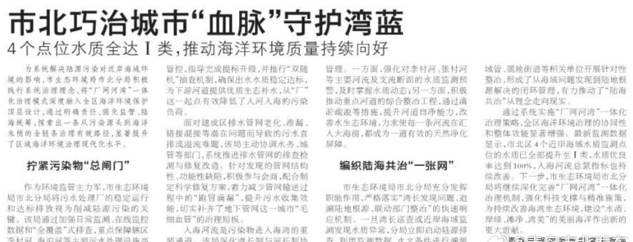 市北巧治城市“血脉”守护湾蓝 4个点位水质全达Ⅰ类,推动海洋环境质量持续向好 青岛晚报 为系统解决陆源污染对近岸海域环境的影响,市生态环境局市北分局积极践行系统治理理念,将“厂网河湾”一体化治理模式深度融入全区海洋环境保护顶层设计,通过明确责任、强化监管、陆海统筹,探索出一条从污染源头到海洋末梢的全链条治理有效路径,显著提升了区域海洋环境治理现代化水平。网页链接