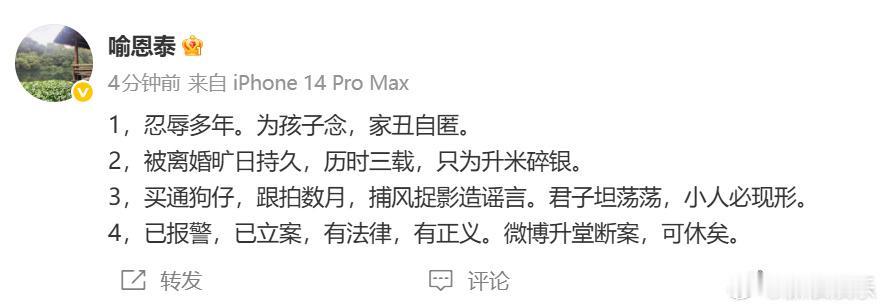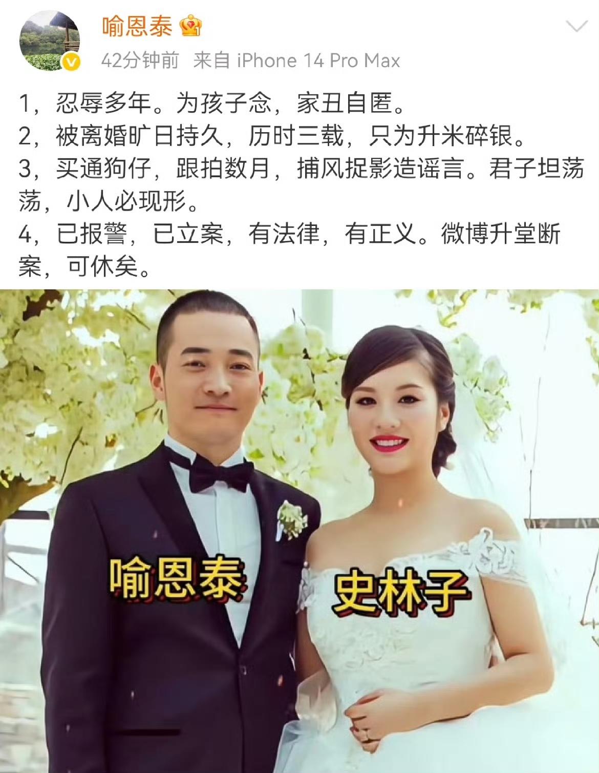 喻恩泰婚变新进展,三天反转3次,来看看喻恩泰是怎么回应的? 喻恩泰时隔五年发的第一条微博,回应婚变传闻:忍辱多年,为孩子家丑自匿,离婚历时三年,但因资产问题未达成协议,被爆出轨是史林子买通狗仔跟拍,都是捕风捉影,最后还说已报警立案。 按他的说法,前面的爆料都是真的,只有说他出轨是假的,但又有狗仔喊话喻恩泰:“你发出这段文字你脸红吗?”,看来还是有不为人知的隐情。 从目前双方当初的证据来看,史林子的错误好像更大,有恢复的聊天记录还有她出gui的当事人老婆出来爆料锤她,不知道史林子会不会出来回应。 不过喻恩泰能回应倒是挺好的,拒绝微博升堂断案,最后还是得相信法律和正义,等判决结果。