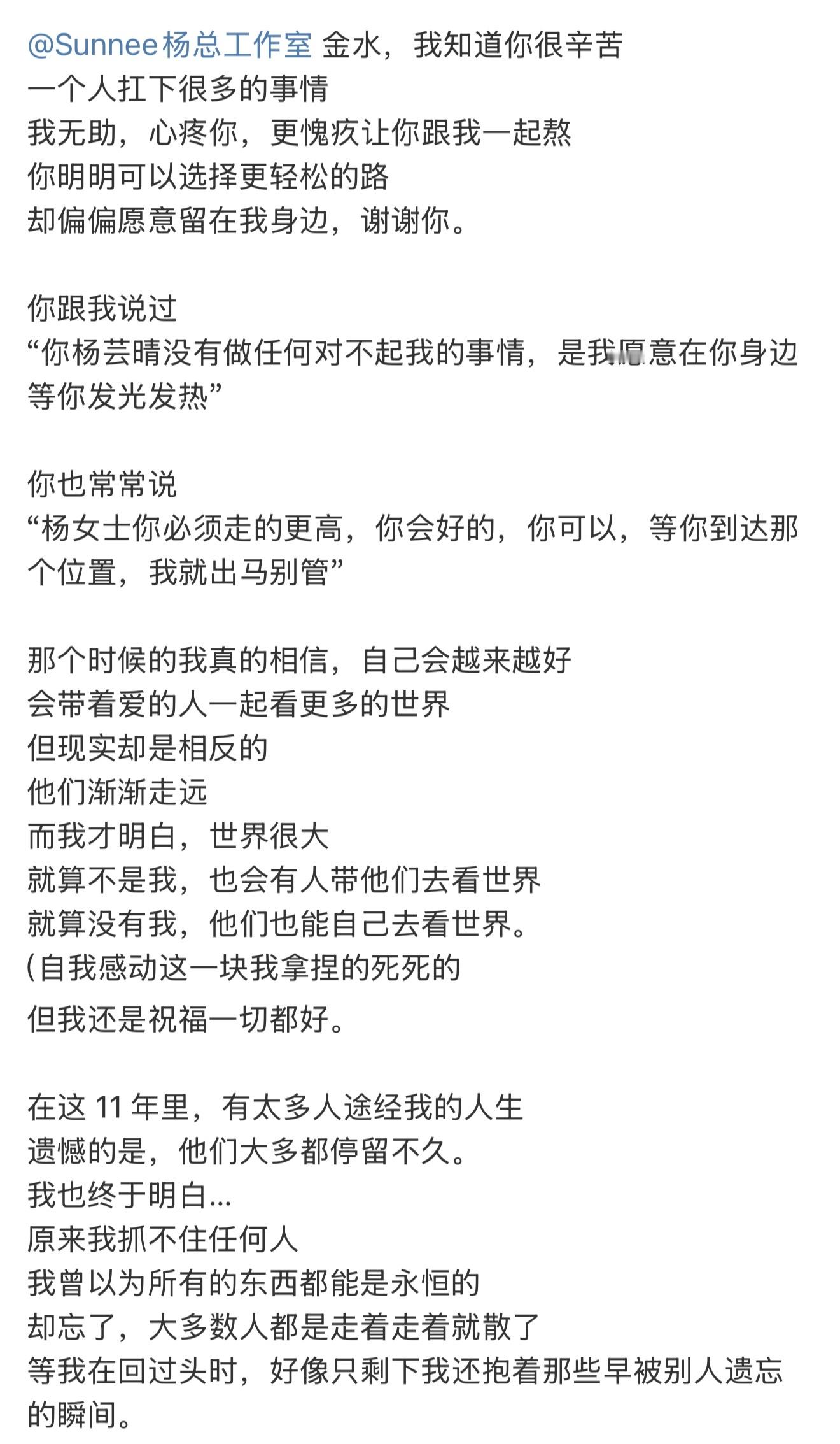 杨芸晴出道十一周年发的长文🥹💧提到在这些年里走散的人。她说:“那个时候的我真