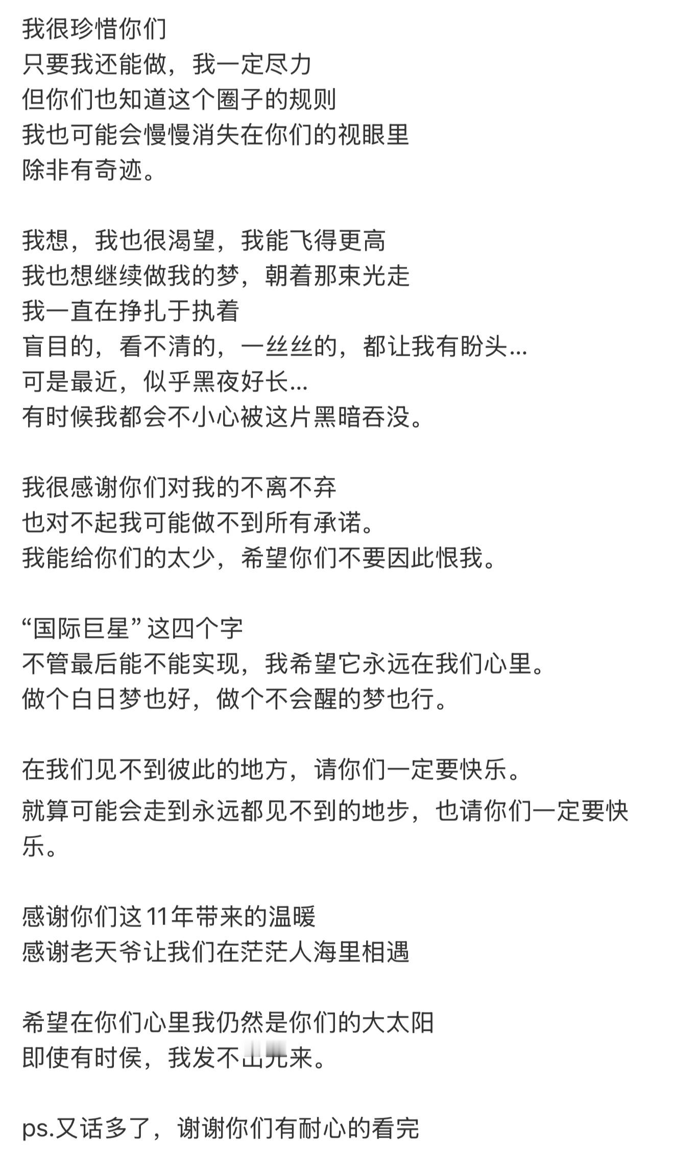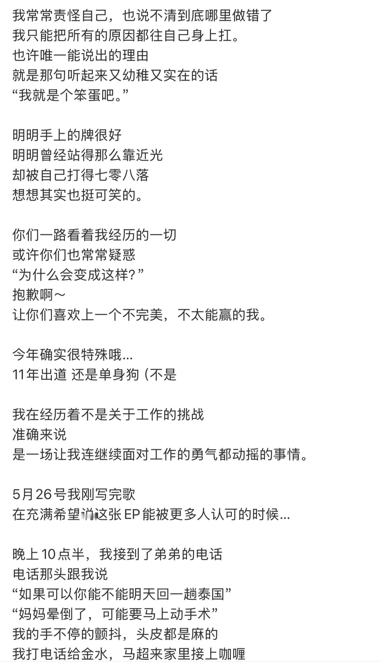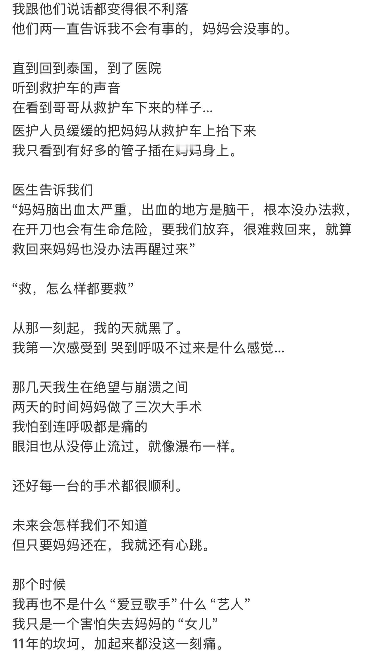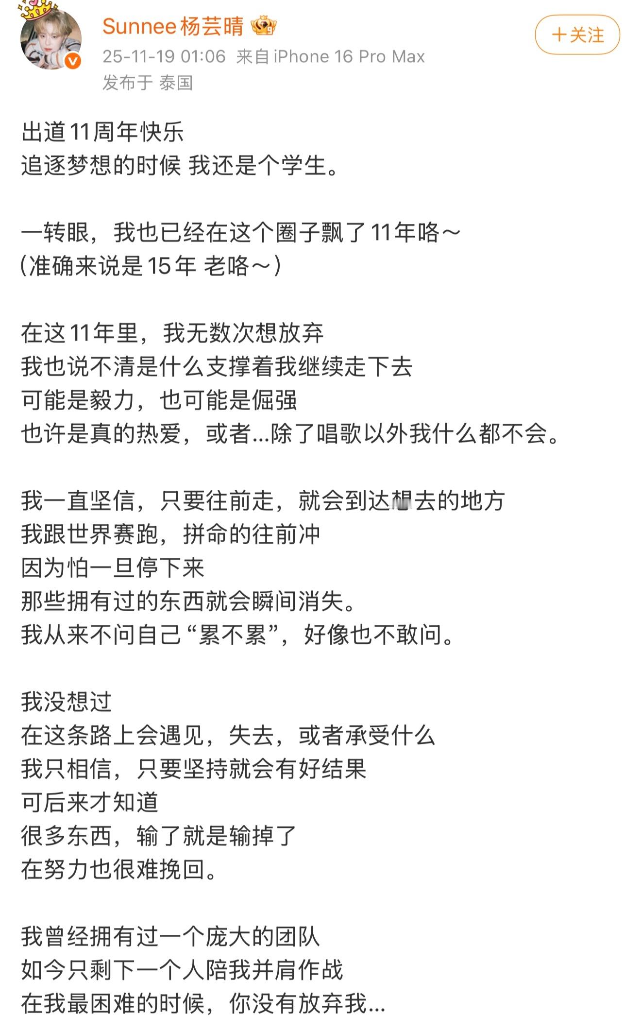 杨芸晴出道十一周年发的长文🥹💧提到在这些年里走散的人。她说:“那个时候的我真的相信,自己会越来越好,会带着爱的人,一起看更多的世界。但现实却是相反的,他们渐渐走远,而我才明白,世界很大。就算不是我,也会有人带他们去看世界。就算没有我,他们也能自己去看世界。但我还是祝福一切都好。”“在这11年里,有太多人途经我的人生。遗憾的是,他们大多都停留不久。我也终于明白…原来我抓不住任何人。我曾以为所有的东西都能是永恒的,却忘了,大多数人都是走着走着就散了。等我在回过头时,好像只剩下我还抱着那些早被别人遗忘的瞬间。”谈起刚写完歌满心期待会得到更多人认可,却接到妈妈晕倒需要动手术的消息,她说:“那几天我生在绝望与崩溃之间两天的时间妈妈做了三次大手术我怕到连呼吸都是痛的。眼泪也从没停止流过,就像瀑布一样。还好每一台的手术都很顺利。未来会怎样我们不知道,但只要妈妈还在,我就还有心跳。”“那个时候,我再也不是什么“爱豆歌手”什么“艺人”。我只是一个害怕失去妈妈的“女儿”。11年的坎坷,加起来都没这一刻痛。”对一直陪伴着她的人,她说:“在我们见不到彼此的地方,请你们一定要快乐。就算可能会走到永远都见不到的地步,也请你们一定要快乐。感谢你们这11年带来的温暖,感谢老天爷让我们在茫茫人海里相遇。希望在你们心里我仍然是你们的大太阳,即使有时侯,我发不出光来。”