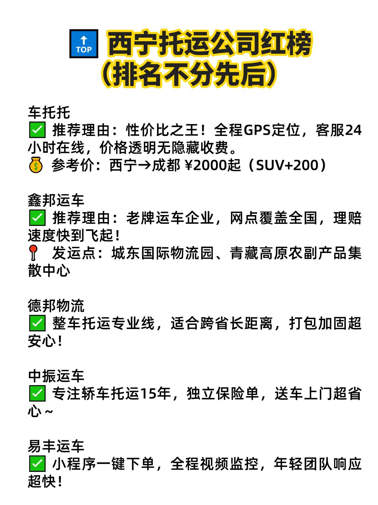 🔝 西宁托运公司红榜(亲测靠谱) 车托托 ✅ 推荐理由:性价比之王!全程GPS定位,客服24小时在线,价格透明无隐藏收费。 💰 参考价:西宁→成都 ¥2000起(SUV+200) 鑫邦运车 ✅ 推荐理由:老牌央企背书,网点覆盖全国,理赔速度快到飞起! 📍 发运点:城东国际物流园、青藏高原农副产品集散中心 德邦物流 ✅ 整车托运专业线,适合跨省长距离,打包加固超安心! 中振运车 ✅ 专注轿车托运15年,独立保险单,送车上门超省心~ 易丰运车 ✅ 小程序一键下单,全程视频监控,年轻团队响应超快! 📍 西宁发运点大全 ✔️ 物流园集中点 城东国际物流园(公司最多!选车方便) 青海闽龙国际物流园(大车专线多) 青藏高原农副产品集散中心(鑫邦驻点) ✔️ 火车站专线 西宁站货场(铁路托运,适合不怕慢的车主) ⚠️ 托运必看避坑指南 必须带行驶证原件!(登记用,无需随车) 保险要独立保单! 别信口头承诺,保额≥30万才靠谱! 清空油箱1/4 ➕ 拆ETC!否则风险自担! 签合同前拍全车视频!划痕、里程数重点记录! 💡 小贴士: 👉 旺季提前3天预约!别等到临出发才问价~ 👉 低价陷阱别踩!报价低于市场价80%的,大概率中途加价!