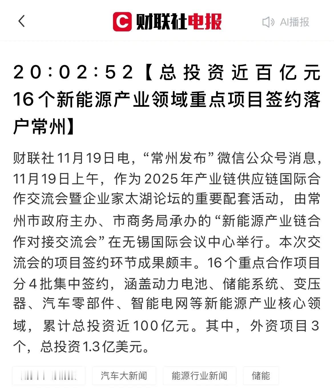 百亿热钱砸向常州!这几位“新能源大佬”要躺赢?今天,常州新能源产业迎来一场资本盛宴!签约16个重点项目,总投资近100亿。全部砸向动力电池、储能、智能电网等最火热的核心领域。这不仅是一次简单的招商,更是常州巩固其“新能源之都”地位的强力信号。钱流向哪里,机会就在哪里。以下A股公司有望受益:电池:· 宁德时代&亿纬锂能:在常州溧阳有重资产布局的全球龙头,新一轮的投资将进一步完善其产业链生态,巩固其绝对领先地位。· 国轩高科:技术派代表,其磷酸铁锂和固态电池技术,与常州重点发展的产业方向高度契合。本土企业:· 苏文电能:总部位于常州的公司,是本次签约最直接的“地主”。其主营的智能电网和微电网业务,将直接承接本地新能源项目爆发的建设需求。· 江苏有线:省属国企,已与苏文电能联手在常州布局“光储充”场站,国资背景使其在获取本地项目上优势明显。储能:· 阳光电源:全球储能系统龙头,常州乃至全国储能产业的扩张,都是其产品的巨大市场。风口之上,龙头最先起飞。百亿投资不是终点,而是引爆新一轮产业链升级的起点。上游材料、智能电网设备等环节都将随之受益。