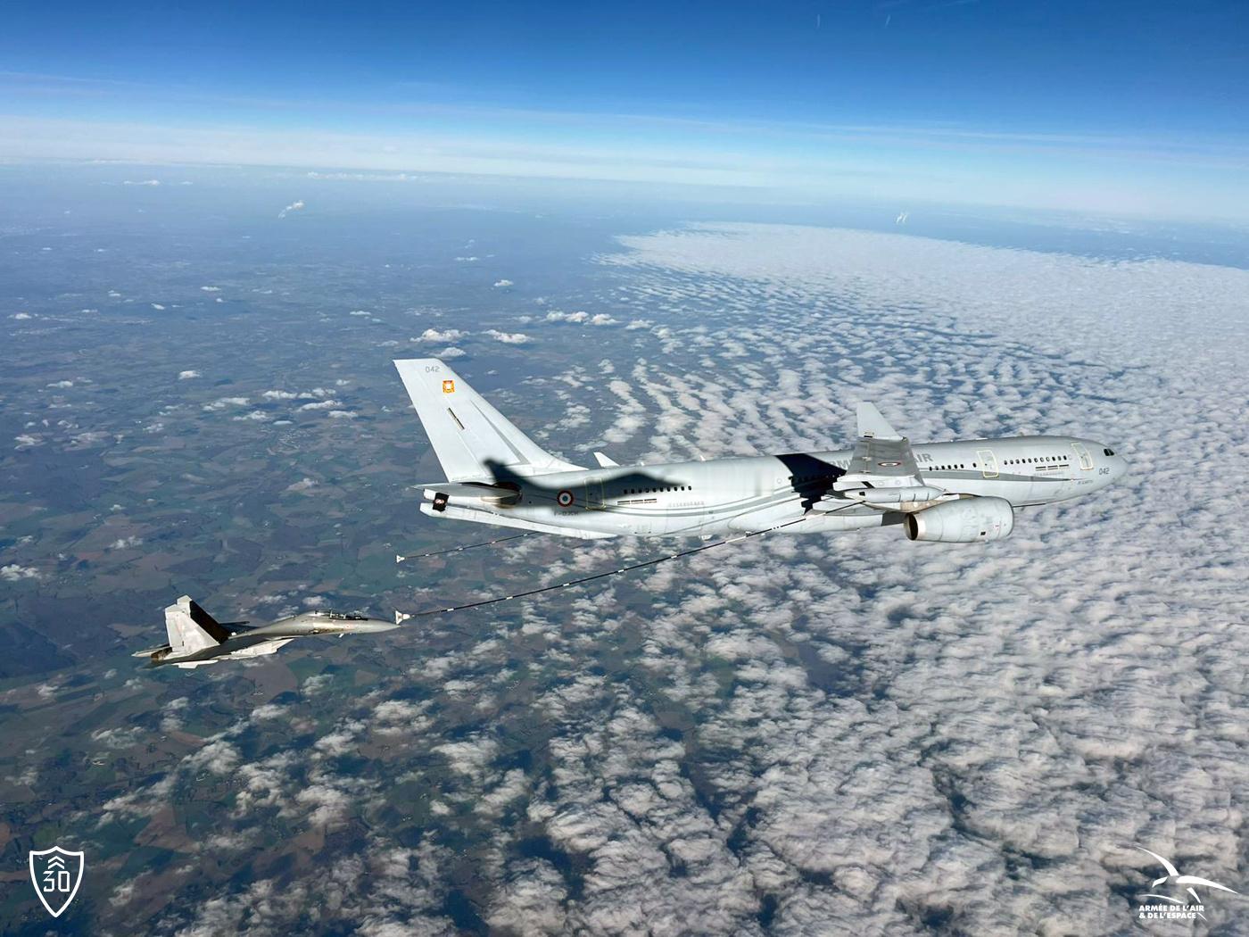 正在法国蒙德马桑市参加“Garuda 25”法-印联合军演的印度空军苏-30MKI战斗机接受法国空天军A330 多用途空中加油/运输机(MRTT)的空中加油。