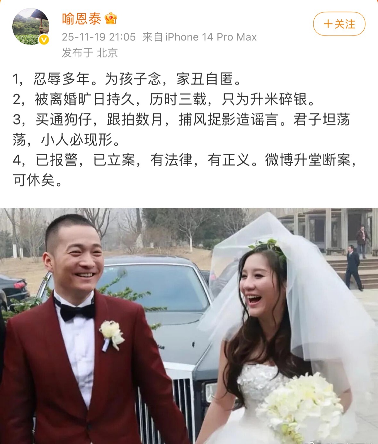 喻恩泰时隔五年发博回应近期婚变传闻:1.为了孩子忍辱多年。2.离婚离了三年。3.史林子买通狗仔跟拍造谣。4.已报警,已立案。