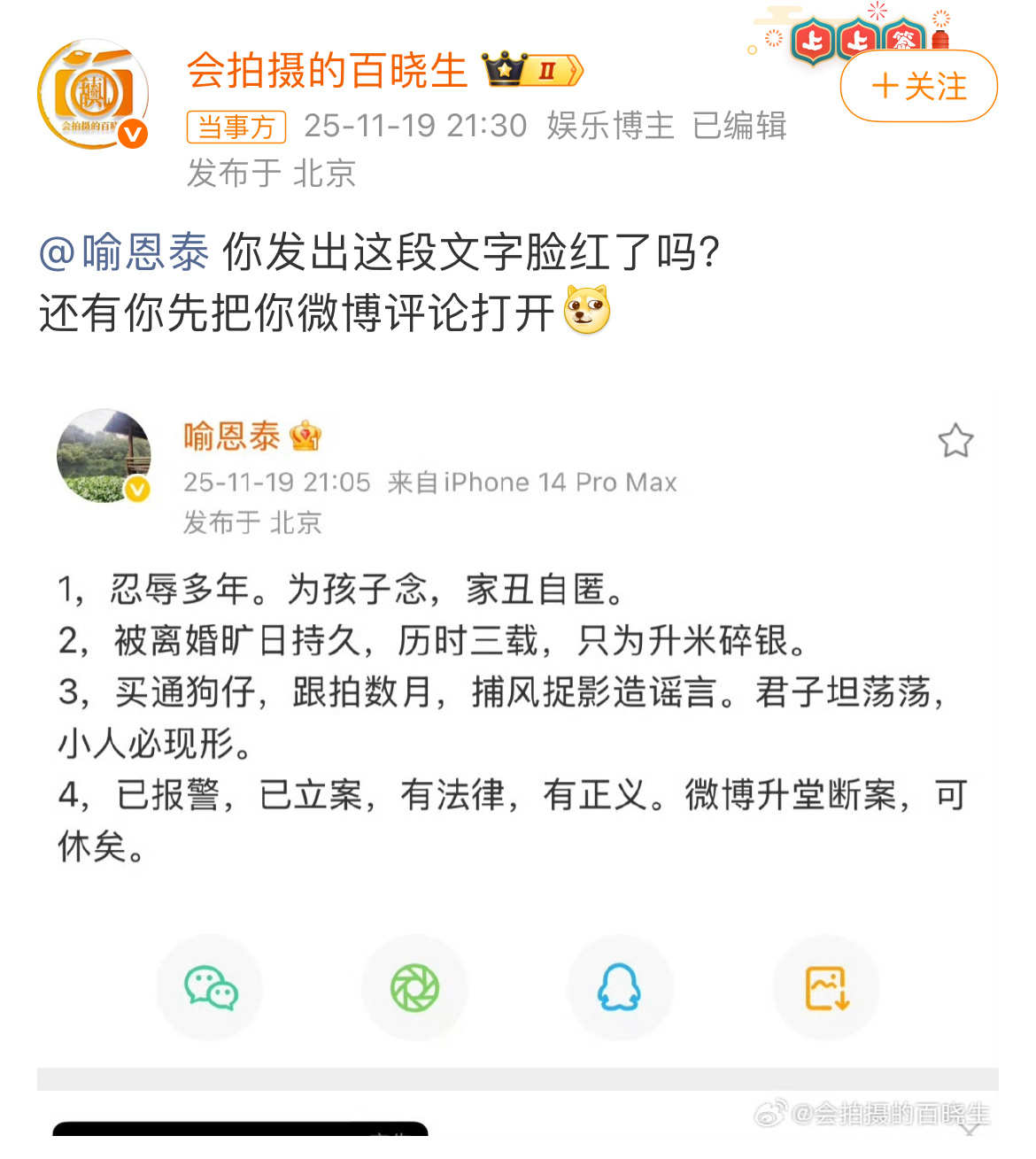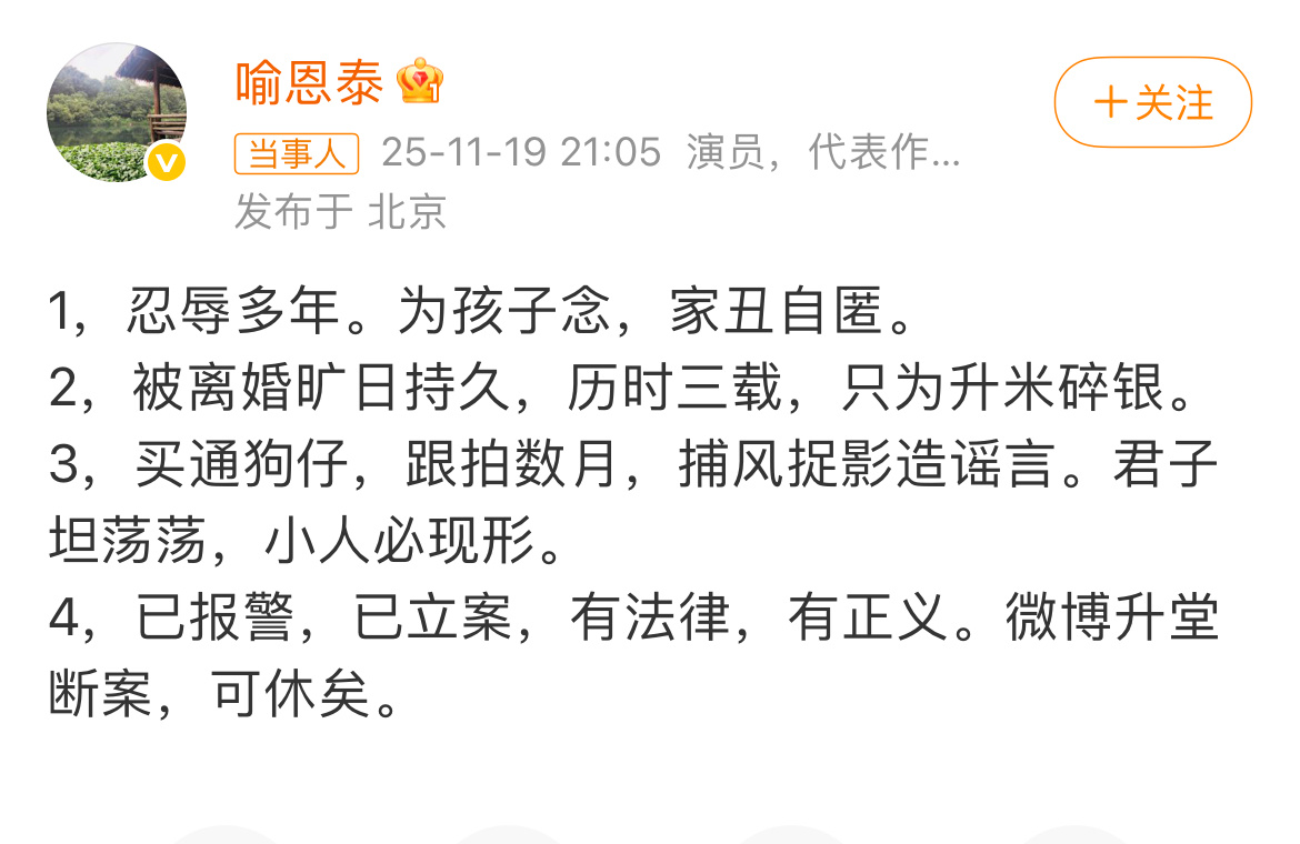 时隔五年更新微博,喻恩泰回应婚变风波称:为孩子忍辱多年,家丑未外扬;离婚纠纷已持续三年,因为财产分割争议;指控前妻史林子买通狗仔、长期跟拍、制造谣言,自己已报警立案