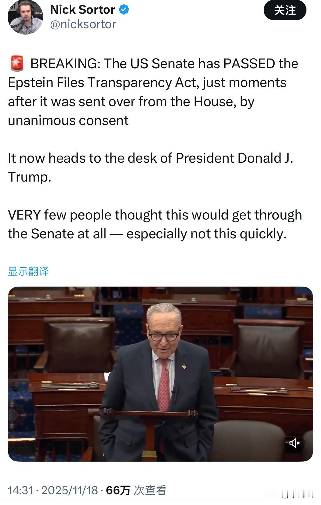 突发新闻:美国参议院在众议院将《爱泼斯坦档案透明法案》提交参议院后不久,便以全票通过了该法案。 现在,这份文件将送至唐纳德·J·特朗普总统的办公桌上。 几乎没有人认为这项法案能在参议院获得通过——尤其是这么快就通过。