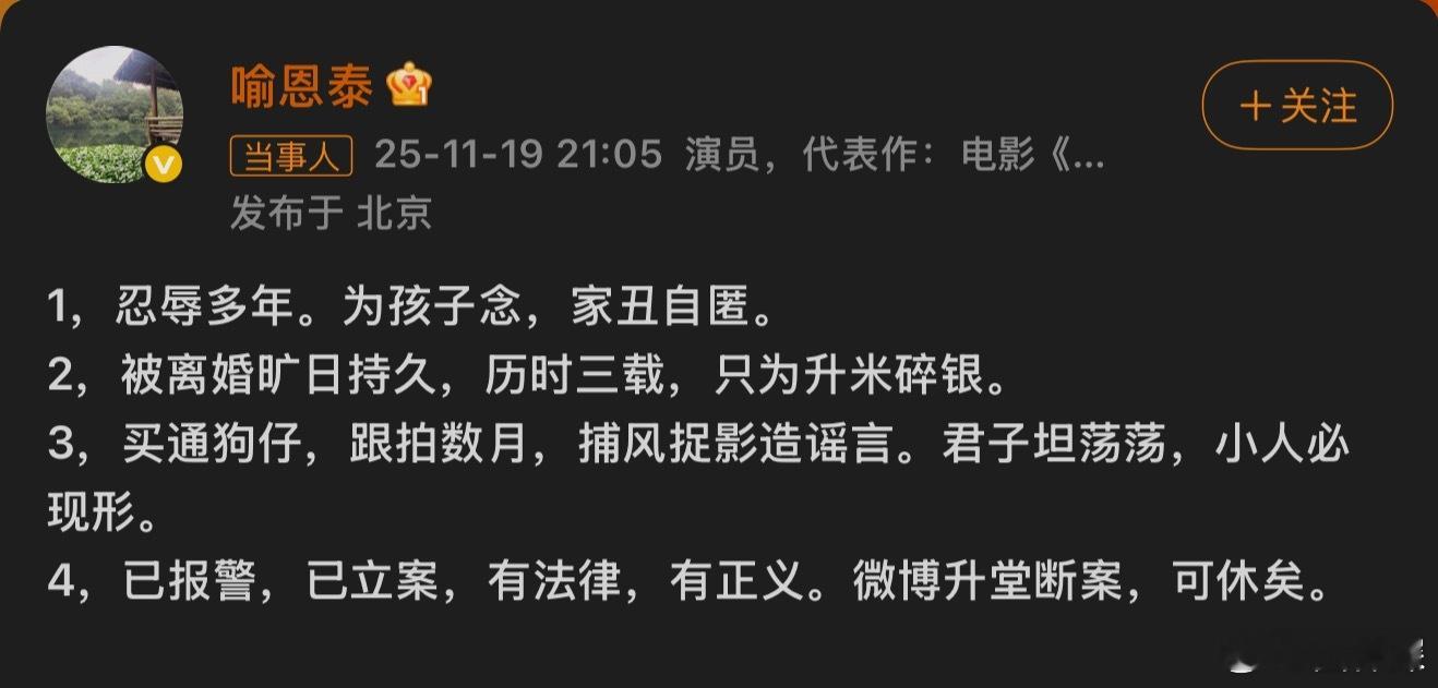 喻恩泰时隔五年再更微博是回应最近的婚变传闻,他的意思很简单∶离婚因为钱的事情闹