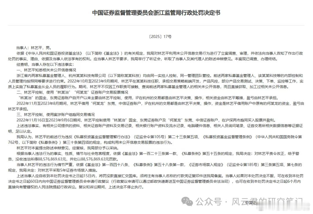 某头部量化私募员工被罚1.77亿元,发生了什么?最近,一份来自证监局的行政处罚决定书在金融圈刷屏了。当事人林艺平,作为一家头部量化机构的核心员工,他身兼策略开发与风控重要职位,能直接接触到公司最核心的交易指令。然而,在2022年11月至2023年9月这段期间,他却利用控制的他人证券账户,在公司资金入场前同步甚至提前买卖相同股票,照着量化指令做趋同交易。说白了就是,他一边在公司操盘,一边用“马甲账户”搭便车,轻松获利。最终,他也被处以没一罚一的顶格处罚,合计1.77亿元。说到这,肯定很多人跟风云君一样都非常震惊。在不到一年时间里,他通过上述操作获利超过8800万元,这未免也太夸张了!我们大胆做个简单测算:假设本金2亿元,收益率高达44%即便本金扩大到4亿元,收益率也超过22%绝对值上来看,这已经是非常高的收益了。但更值得注意的是,那段时间A股整体震荡,上证指数几乎零增长,而中证500和中证1000的跌幅分别在-7%、-8%以上。也就是说,这22%的收益妥妥跑赢大盘,相对中证500、中证1000指数更是有接近30%的超额。这也侧面印证,量化策略在当时的A股中就已经表现得相当有实力了。想必大家都会惊叹,量化这么“能打”?其实量化策略尤其有效,一方面与A股市场结构密不可分。我们都知道,A股市场有超2亿的个人投资者,整体可以算是散户主导,其交易行为常常受到情绪驱动,容易形成非理性的波动。而量化模型正是通过海量数据分析,系统性地捕捉这些错误定价机会。例如散户常见的追涨杀跌、跟风打板、迷信技术图形等行为,都能成为量化模型反向利用的信号。另外A股有超5000只股票,大量中小市值公司都是缺乏机构覆盖,定价并不充分,这也为量化选股提供了更多机会。所以量化即使在没有大行情的市场中,依然可以通过捕捉错误定价的机会持续累积超额。当然,也有人说量化是在“割韭菜”,因为它太快太聪明。但客观来说,量化靠发现价格偏差来盈利,其实也在帮助市场快速纠错,提升定价效率。从海外经验来看,量化早已成为市场主流参与者之一,这又何尝不是市场发展的必然趋势呢?另外,不仅A股市场条件适合量化,量化本身也在不断进化。比如数据应用上,现在很多顶尖机构早已不局限在传统财务数据、价量数据上,开始卷另类数据这个新赛道。就像一些新闻、舆情,很多人还认为量化就是机器,对这类信息拿捏不好。但其实量化通过自然语言处理技术,分析新闻、报告和社交媒体的情绪,更能生成非常客观的交易指令。还有其他一些非标准化的数据,普通人看或许看不出什么门道,但量化却可以。再比如一些更前沿的AI技术应用上。就在前不久,一个名为 “Alpha Arena”的AI实盘竞技场也是引发了广泛的关注,多个AI模型在加密货币市场展开为期四周的全自动交易对决。最终,通义千问和DeepSeek这两款国产大模型分别实现22.32%和21.29%的收益率获得冠、亚军,远胜人类选手。这也让很多人意识到,AI技术一定程度上能够独立执行复杂的交易策略。现在国内很多量化机构也将AI技术应用到自己的策略模型中,这对量化来说也是个非常好的加分项。回过头看这起天价罚单确实引发了很多思考。监守自盗的“个人行为”固然可耻,该接受应有的惩处。但量化作为一种方法论,无论是在效率上,还是纪律和广度上都更具有优势。它能捕捉人脑难以识别的交易机会,也能克服人性的弱点。能真正合法合规的服务于投资人,持续获取稳定的超额收益才是对资方最大的回馈,也是资管行业最大的“荣光”吧。
