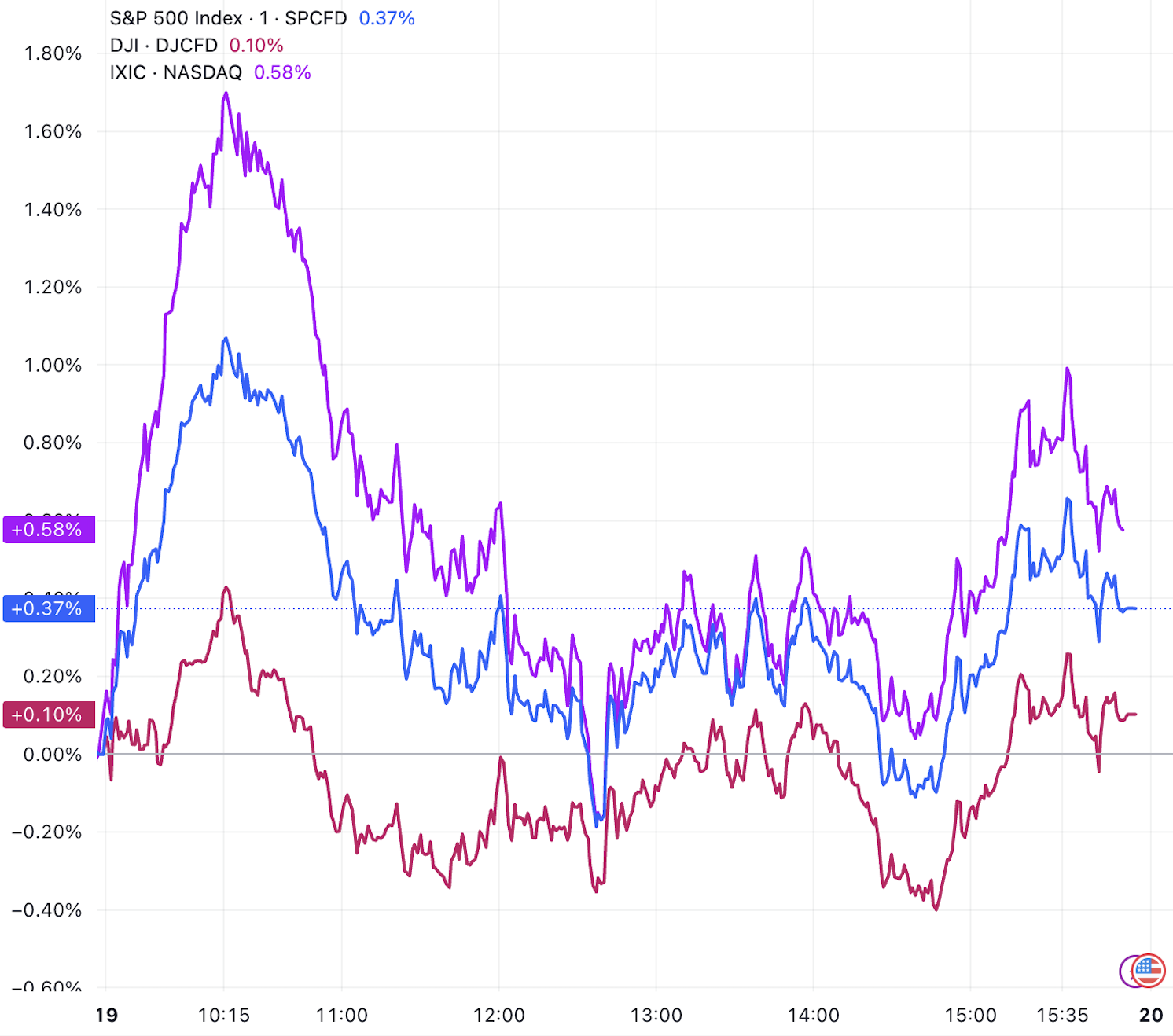 截至收盘,道琼斯指数涨0.10%,报46,138.77点;标普500指数涨0.38%,报6,642.16点;纳斯达克指数涨0.59%,报22,564.23点。
